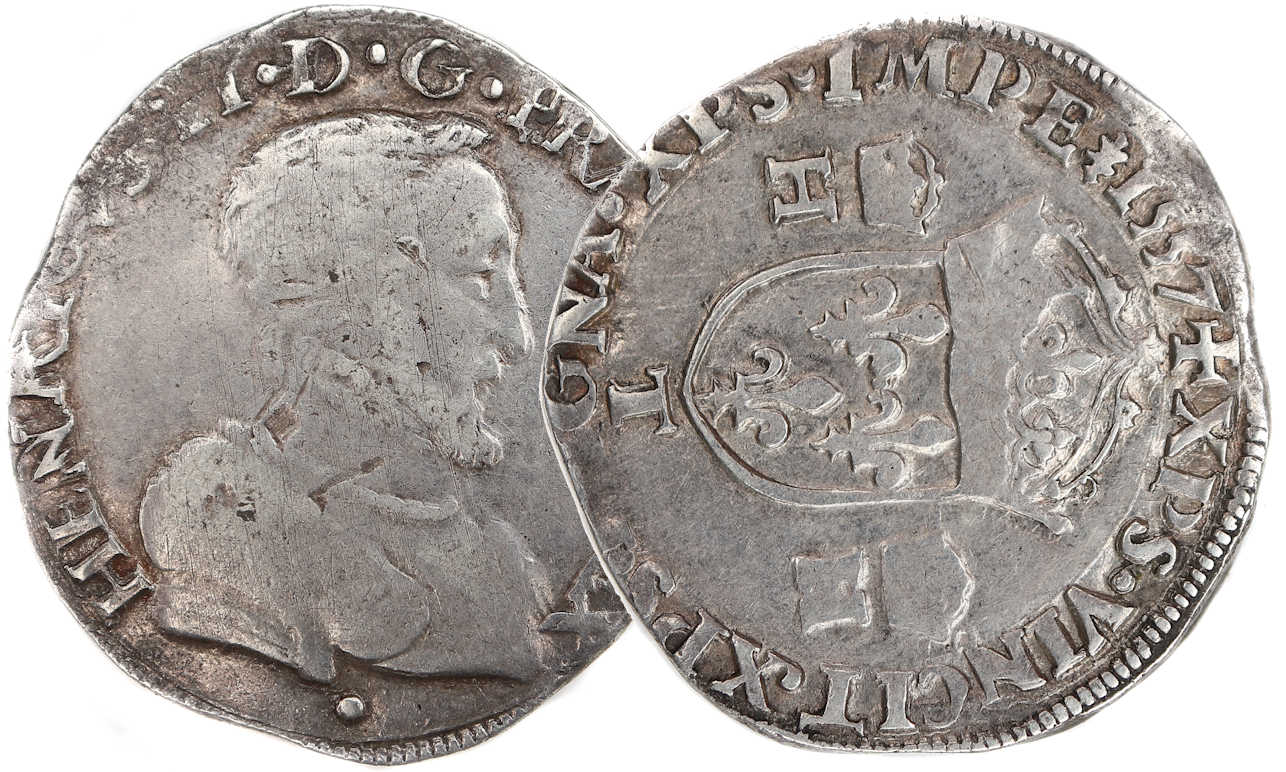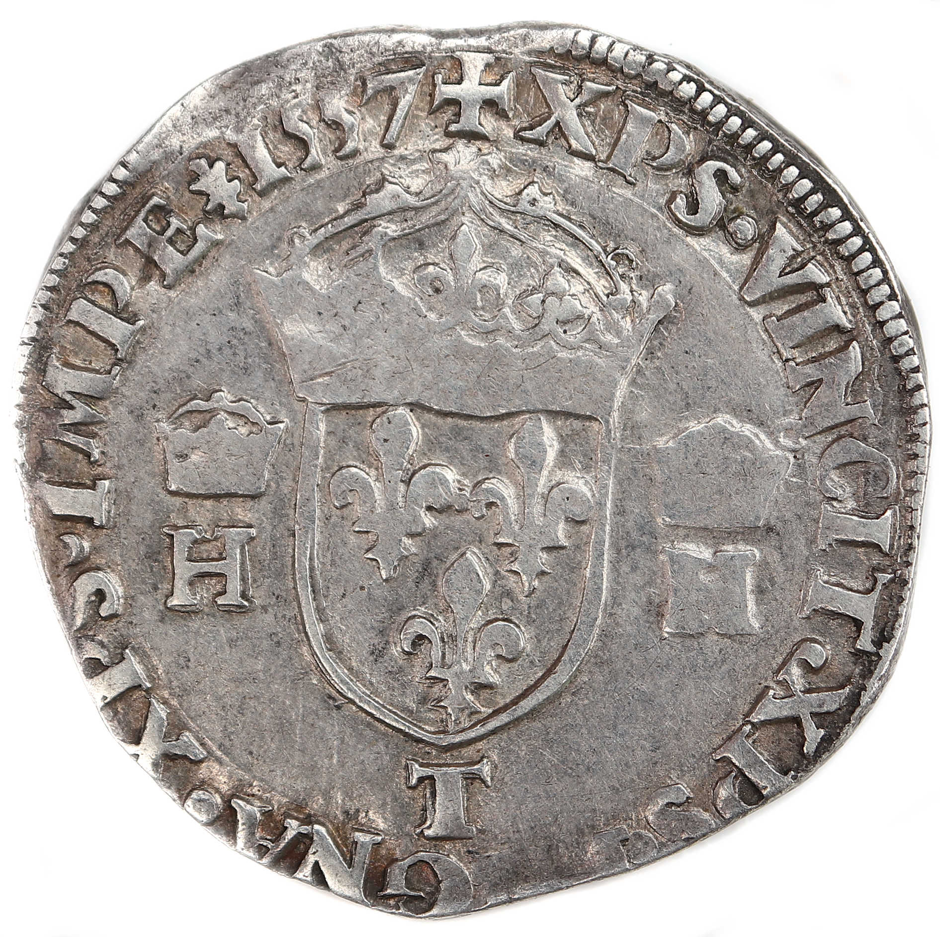 Lettre d'atelier : T (au revers sous l'écu) Point secret : Non Millésime : 1557 Chiffre de frappe connu : 89 971 ex (avec 1/2 testons et