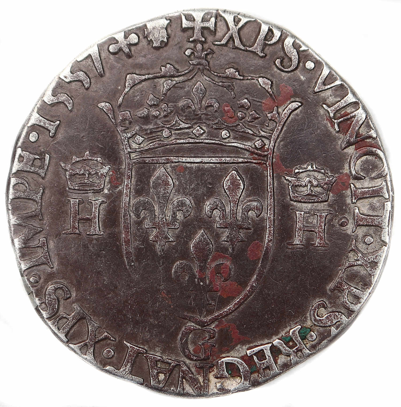 Lettre d'atelier : G (au revers sous l'écu) Point secret : 8éme (au droit) Millésime : 1557 Chiffre de frappe connu : 12 098 ex (avec 1/2 testons) |