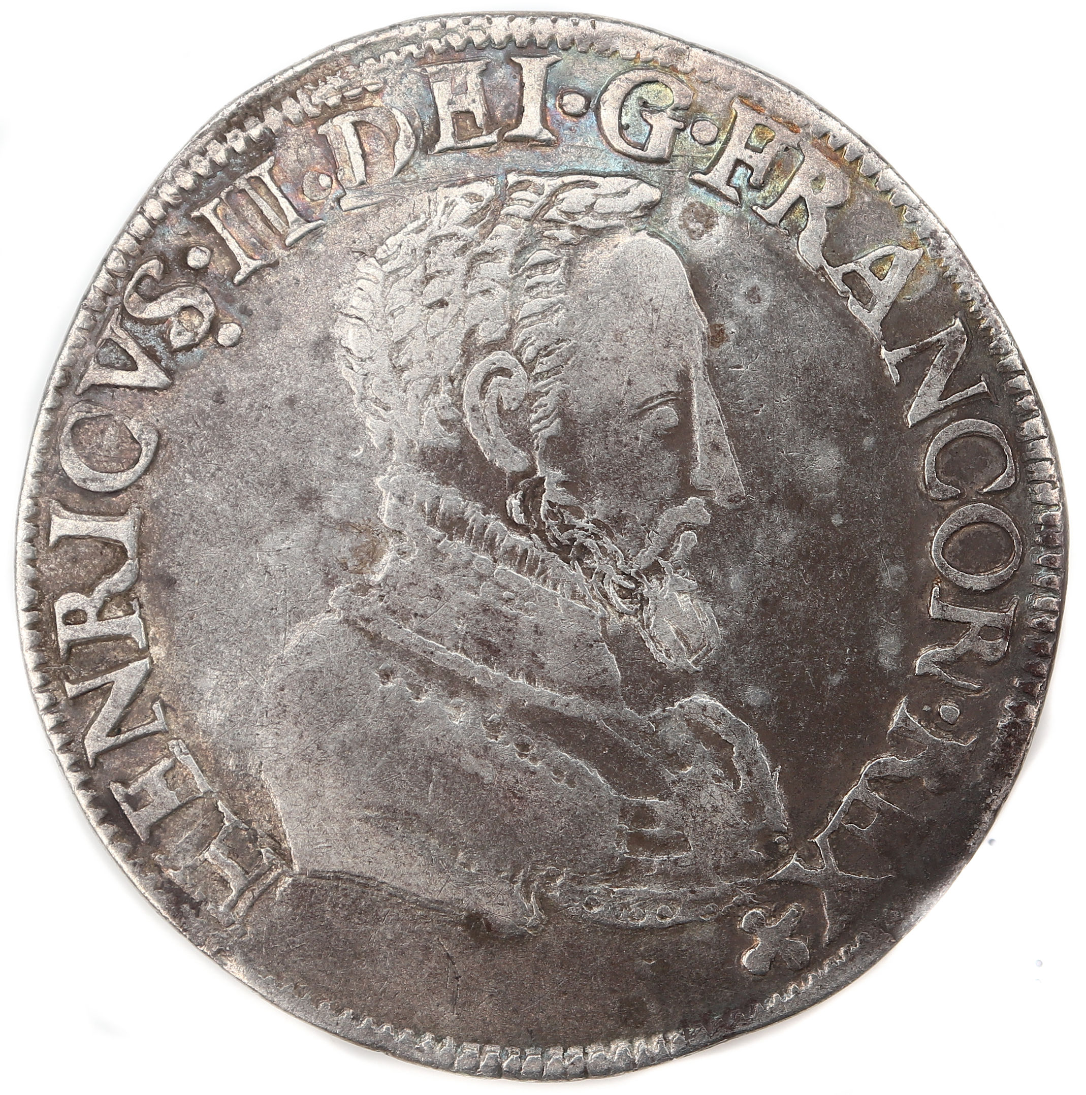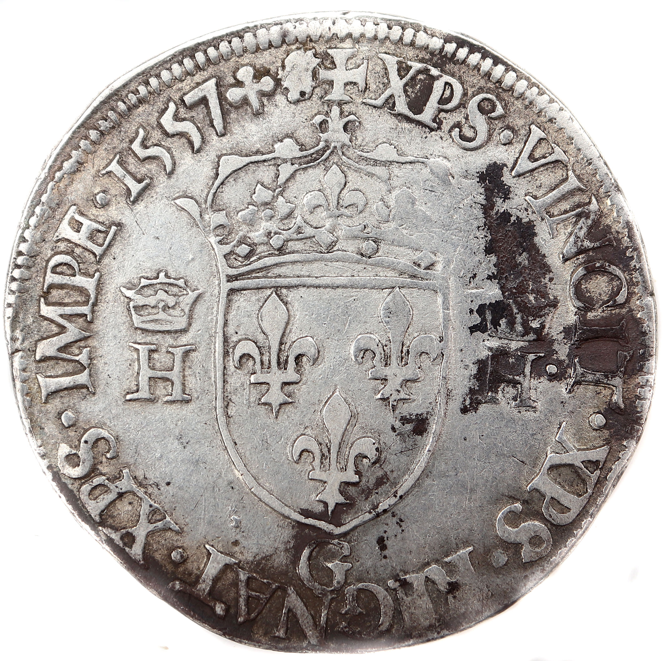 Lettre d'atelier : G (au revers sous l'écu) Point secret : 8éme (au droit) Millésime : 1557 Chiffre de frappe connu : 12 098 ex (avec 1/2 testons) |