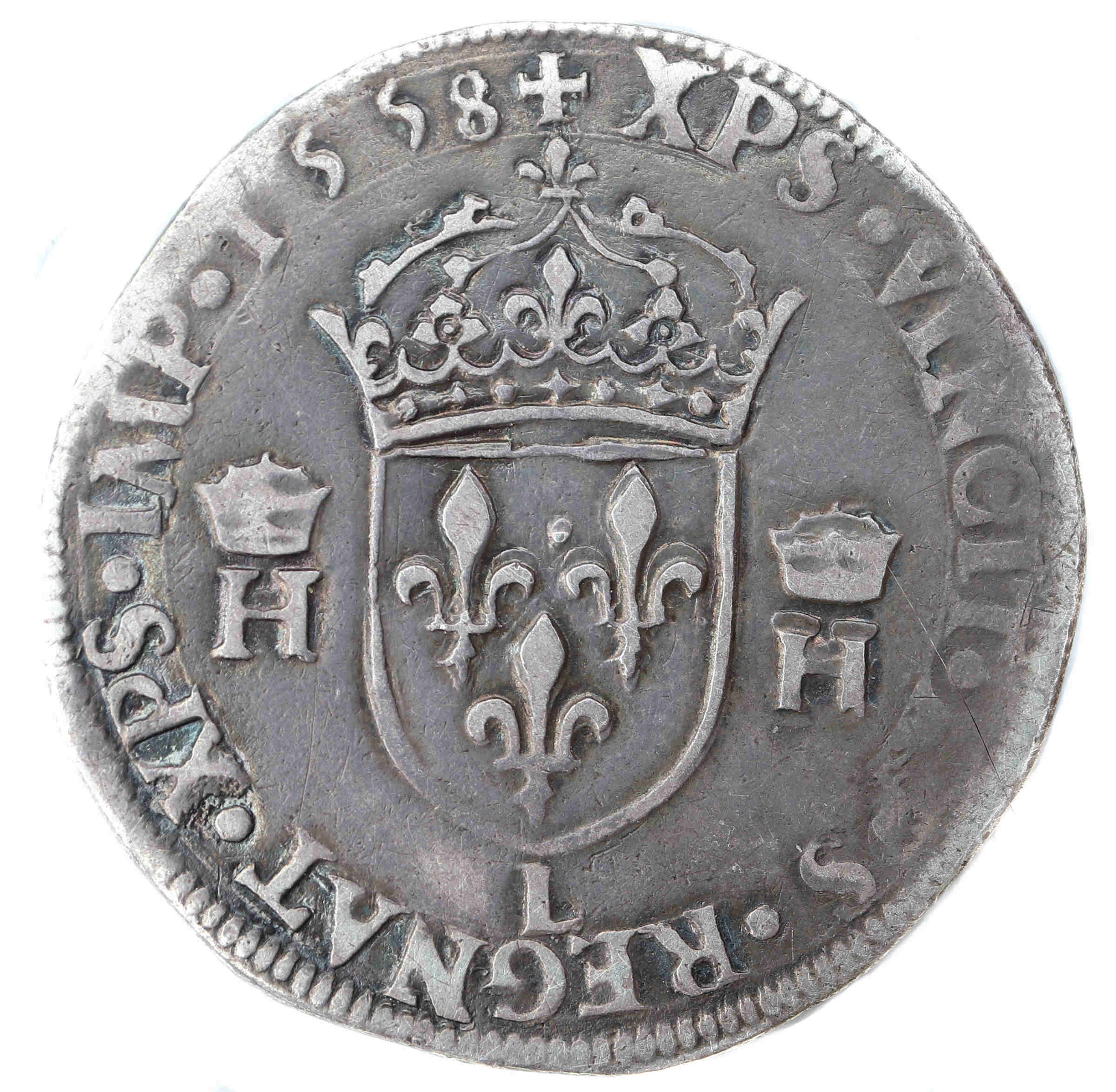 Lettre d'atelier : L (au revers sous l'écu) Point secret : Non Millésime : 1558 Chiffre de frappe connu : 91