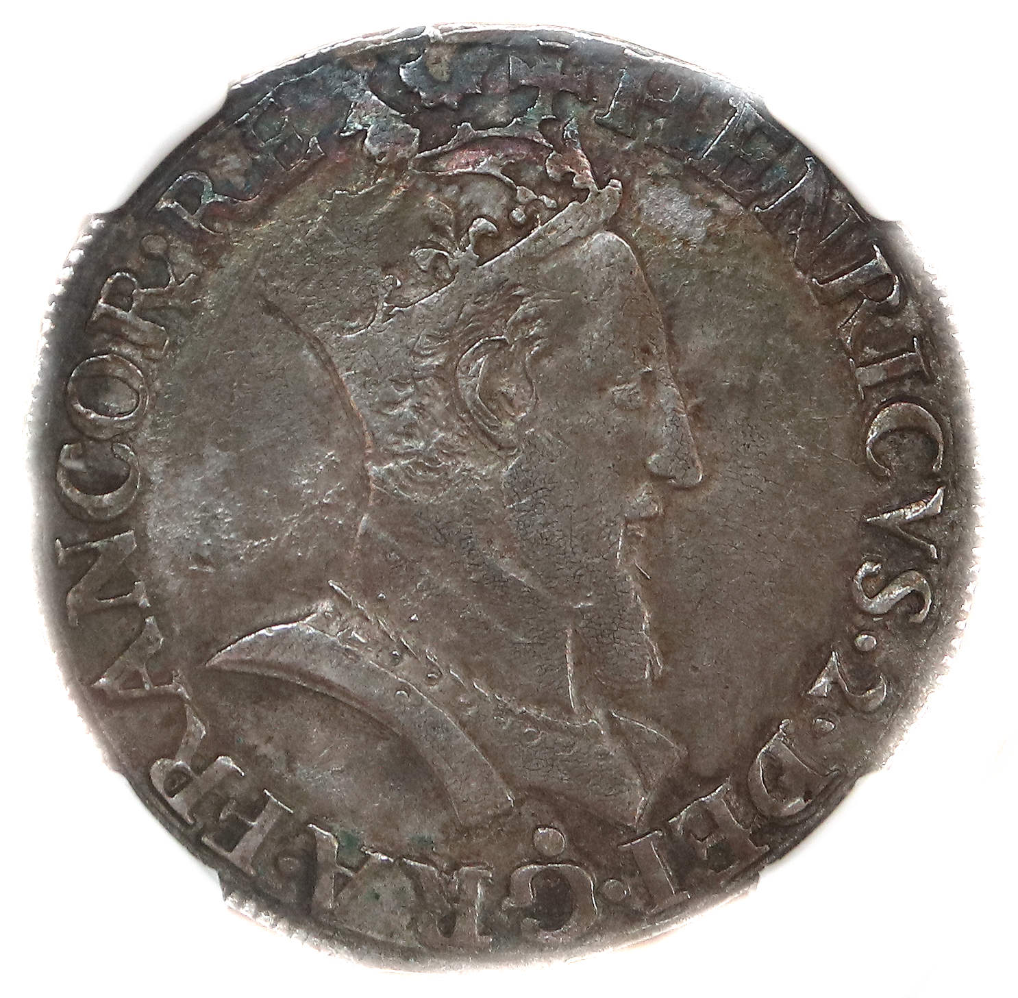 furent frappées par l'atelier de DIJON de 1553 à 1556 puis en 1560 et peut-être en 1561. La monnaie provient de la vente MDC du 13 octobre 2022, avec la description suivante : "NGC AU 55. Bon centrage et frappe correcte malgré quelques faiblesses. Jolie patine grise aux reflets dorés. Très rare. TTB à Superbe. Si le demi-teston est bien connu pour 1560 DIJON, le teston est rarissime et c'est le dernier millésime frappé à ce type à la tête couronnée ! Peut-être 2 ou 3 exemplaires connus : Musée de Roue, collection Bordeaux n° 987 et collection Prieur (non photographié) qui, avec notre exemplaire, pourraient être le même". Voir le demi teston. Axe des coins : 1 h. |