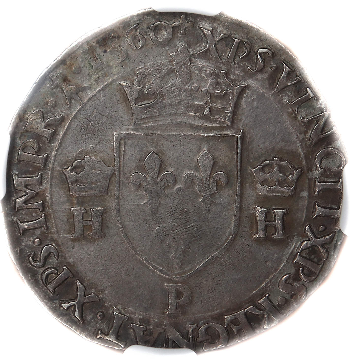 Lettre d'atelier : P Point secret : 13 éme (au revers) et coquille ST JACQUES (fin de légende au droit) Millésime : 1560 Chiffre de frappe connu : NC Indice de rareté : R5 |