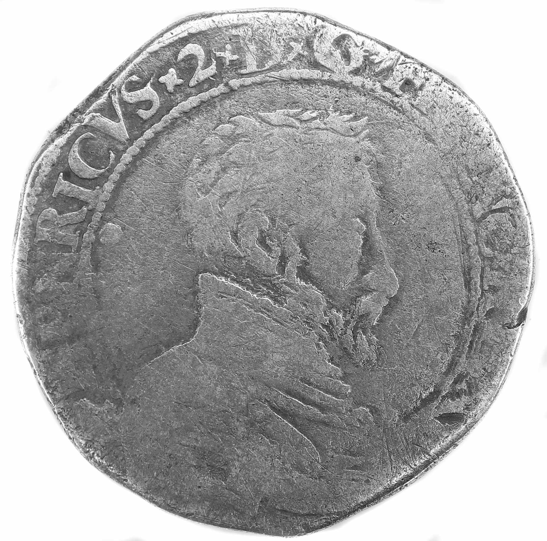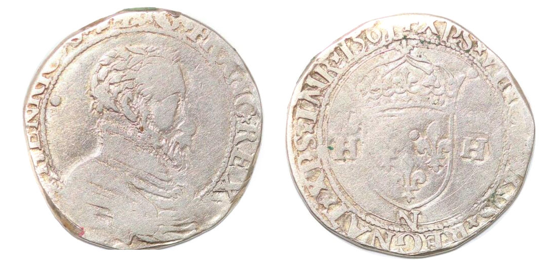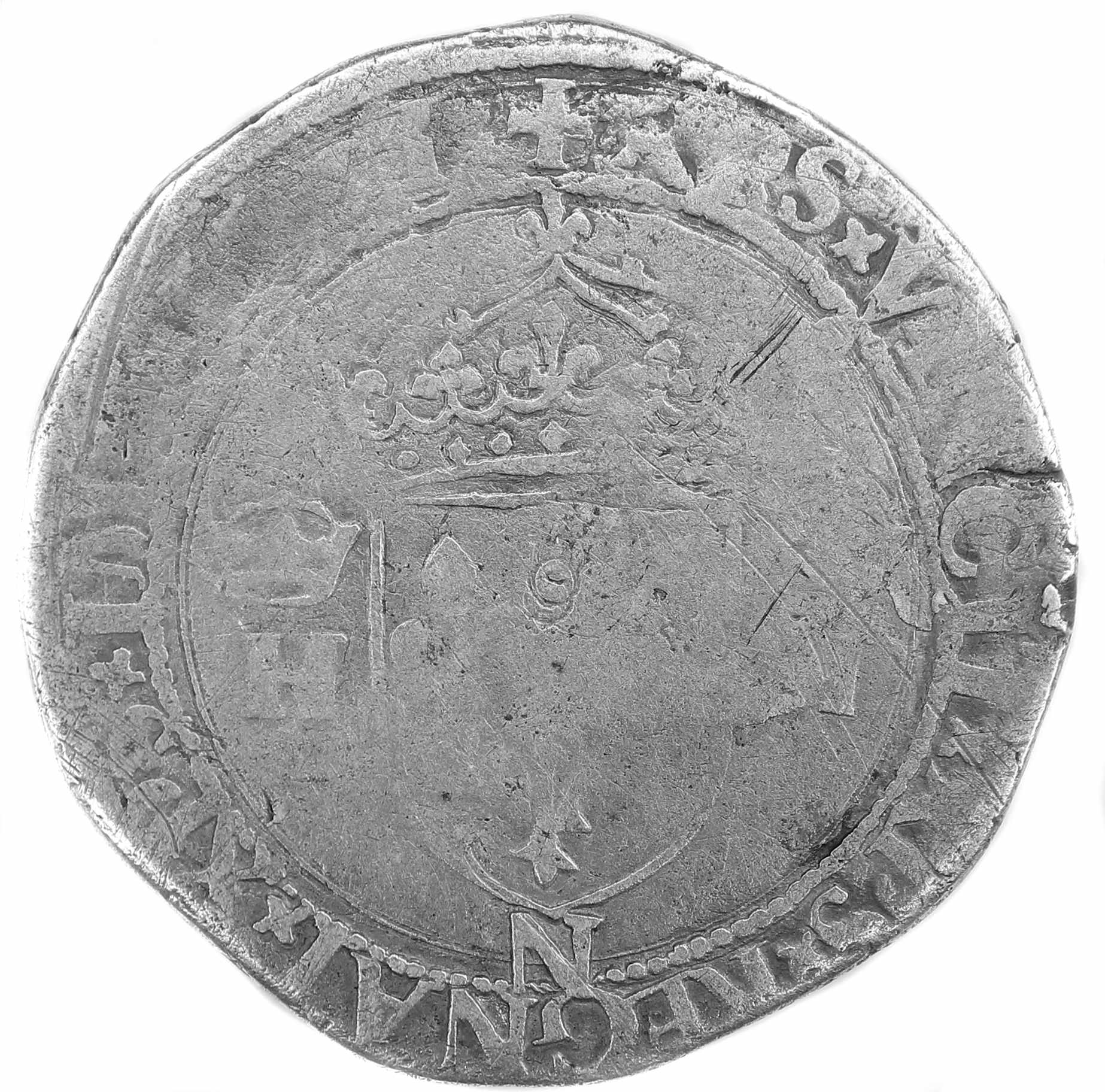 chiffre arabe. La monnaie est trés usée ce qui rend sa datation trés difficile car le millésime n'apparait plus qu'à l'état de trace.. Le différent de Mathieu YMBERT (+ en ponctuation) permet de dater sa fabrication à partir de 1558. Un examen à la lumière rasante semble donner un I pour le dernier chiffre, sans certitude toutefois, ceci attribuerait la monnaie à CHARLES IX. Pour ce millésime , le chiffre de production connu est de 4590 exemplaires avec le demi teston. Lors de la rédaction de Franciae IV, le seul exemplaire connu pour ce millésime faisait partie de la collection PRIEUR. Un autre exemplaire a été proposé à la vente par un professionnel luxembourgeois en 2021. |