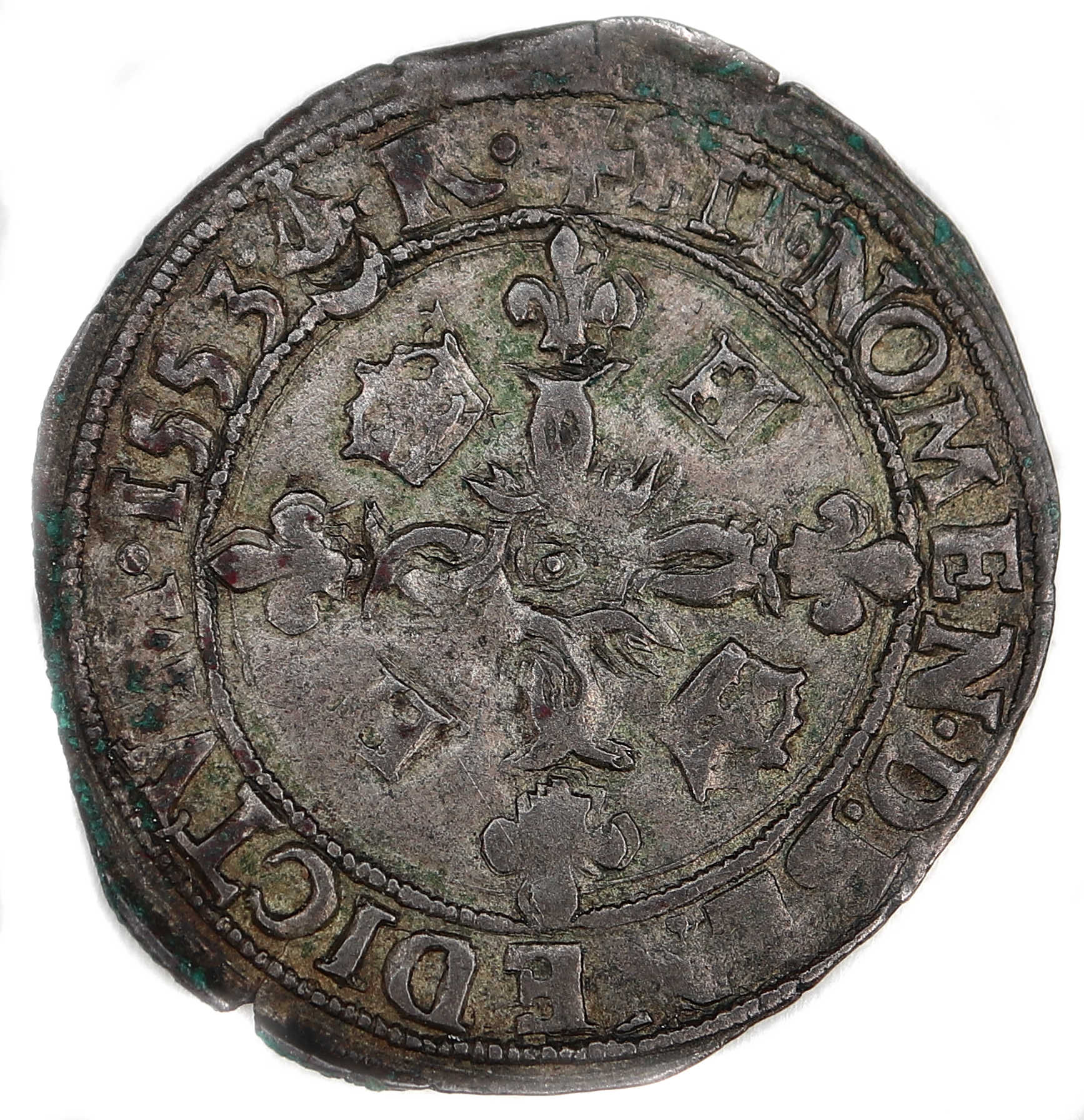 millésime 1553. Le flan est large, ce qui permet à la totalité du grénetis extérieur d'être visible tant au droit qu'au revers. A noter que la titulature du roi se limite à HENRICVS. Belle patine foncée. Axe des coins : 1 h. |