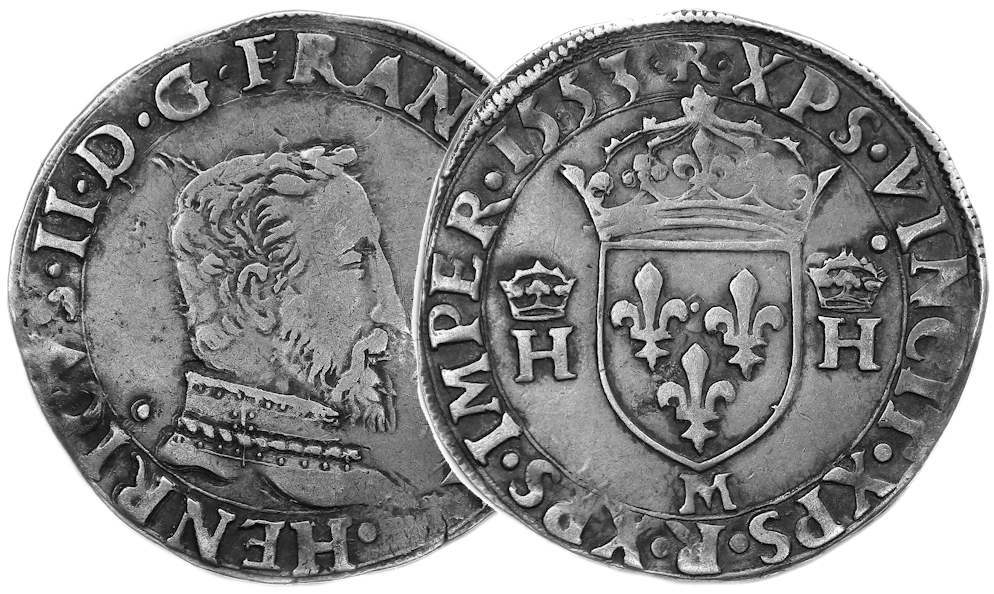 Lettre d'atelier : M (au revers sous l'écu) Point secret : 5éme (au droit) Millésime : 1553 Chiffre de frappe connu : 691 254 ex (avec testons) Indice de