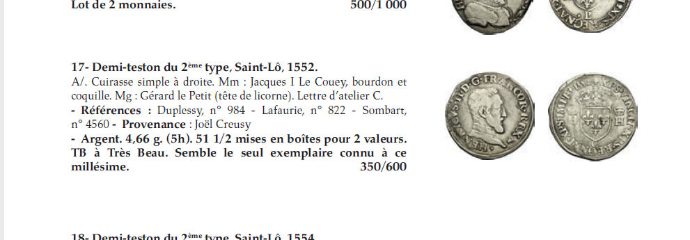 trouve aussi à partir de 1552 (et jusqu'en 1560) des exemplaires "au buste nu". La monnaie provient de la collection François BEAU, dispersée à DROUOT le 7 juin 2017, où elle constituait le lot 17 avec ladescription suivante : "Demi-teston du 2ème type, Saint-Lô, 1552. A/. Cuirasse simple à droite. Mm : Jacques I Le Couey, bourdon et coquille. Mg : Gérard le Petit (tête de licorne). Lettre d’atelier C. - Références : Duplessy, n° 984 - Lafaurie, n° 822 - Sombart, n° 4560 - Provenance : Joël Creusy - Argent. 4,66 g. (5h). 51 1/2 mises en boîtes pour 2 valeurs. TB à Très Beau. Semble le seul exemplaire connu à ce millésime". Remarquons que la référence Sombart est erronnée puisque la vraie référence est 4574 mais l'ouvrage ne mentionne pas l'atelier de ST LO pour le millésime 1552. Provenance : Internet Auction CGB octobre 2021. Axe des coins : 5 h. |