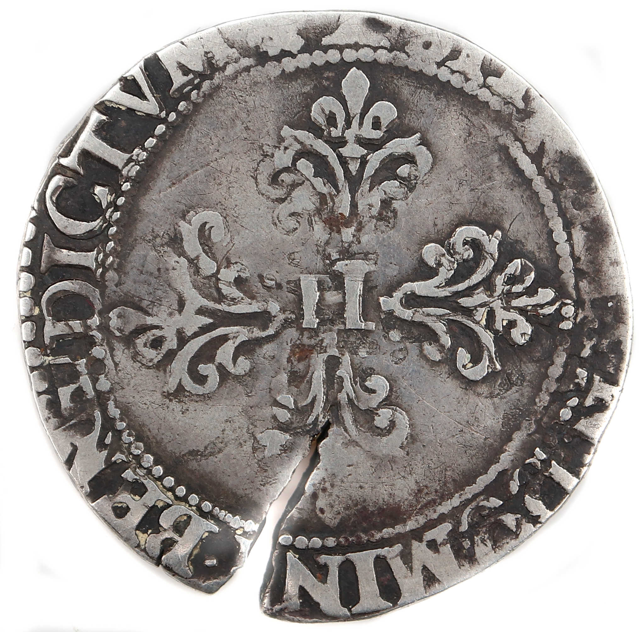 La monnaie est trés usée et préqznte une trés importante fente du flan. La lecture de la lettre d'atelier est difficile. Axe des coins : 7 h |