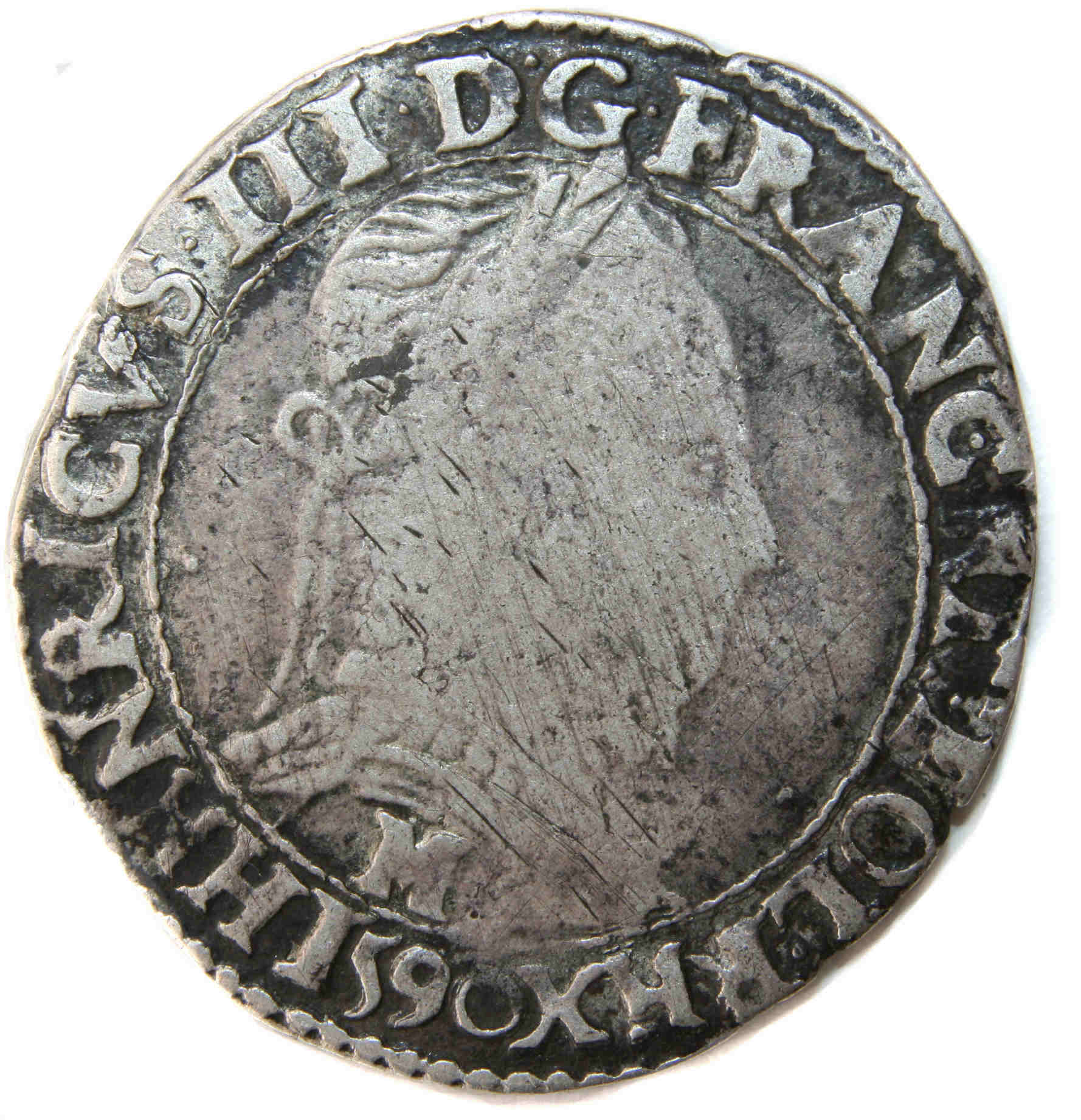 .HENRICVS III.D.G.FRANC.ET.POL.REX 1590 M Henri III par la grâce de Dieu roi des Francs et des Polonais Buste lauré et cuirassé, au col