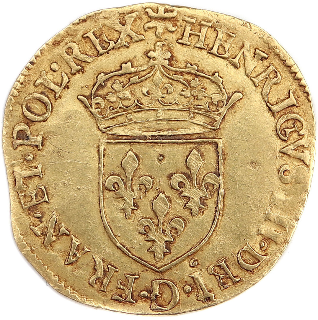 III.DEI.G.FRAN.ET.POL.REX. Henri III par la grâce de Dieu roi des Francs et des Polonais Ecu de France couronné |