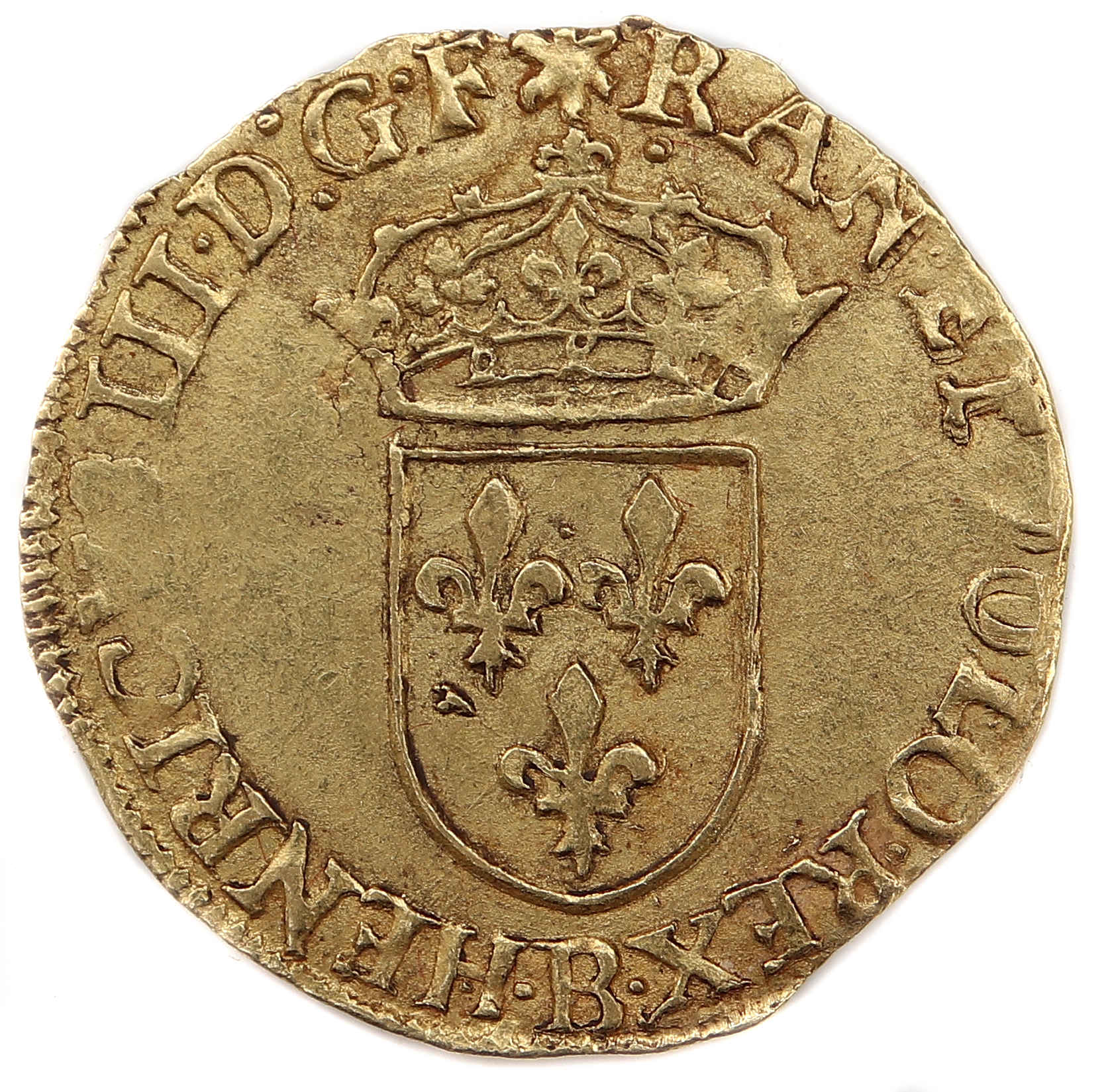 III.D.G.F(soleil)RAN ET.POLO.REX.B Henri III par la grâce de Dieu roi des Francs et des Polonais Ecu de France couronné |