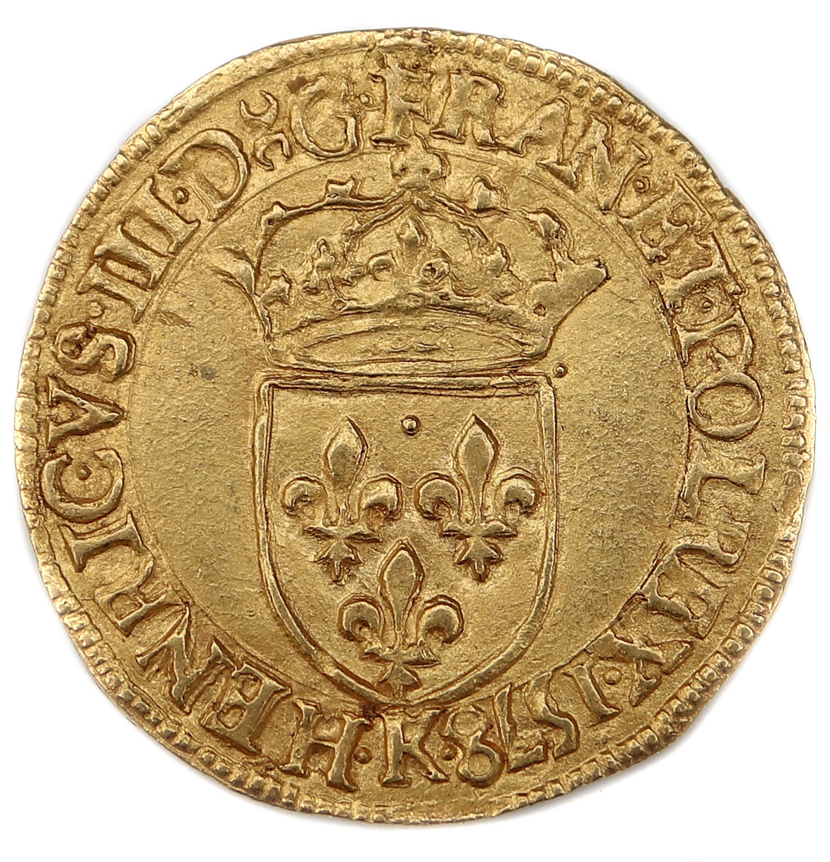 III.D(dif)G.M..FRAN.ET.POL.REX.1578.K Henri III par la grâce de Dieu roi des Francs et des Polonais Ecu de France couronné |