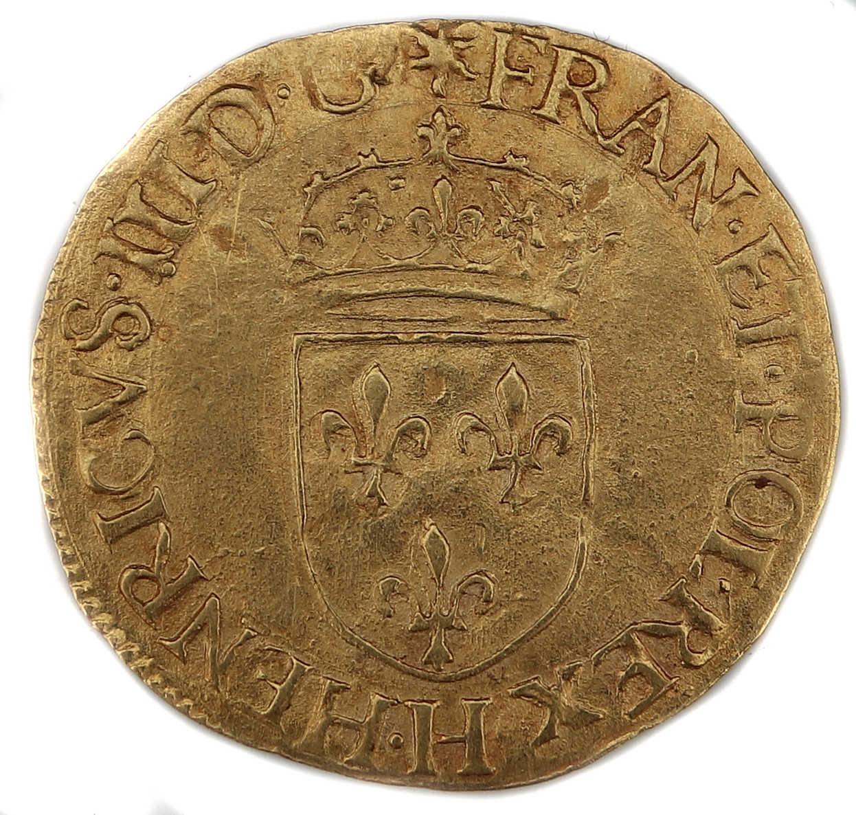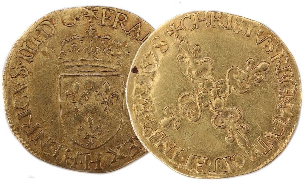 III.D.G(étoile)FRAN.ET.POL.REX.H Henri III par la grâce de Dieu roi des Francs et des Polonais Ecu de France couronné |