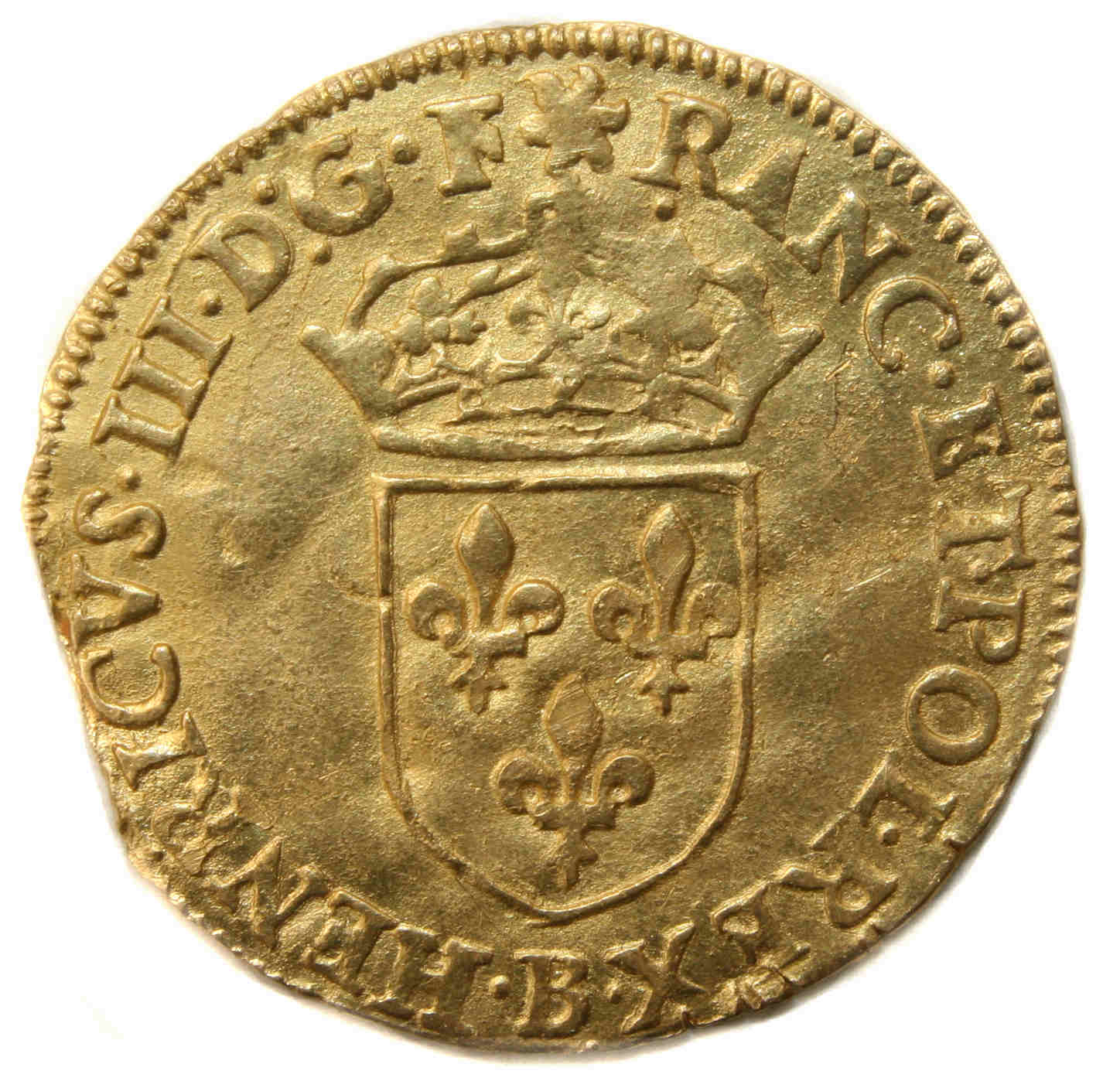 III.D.G.F(soleil)RAN)ET.POL.REX.B Henri III par la grâce de Dieu roi des Francs et des Polonais Ecu de France couronné |