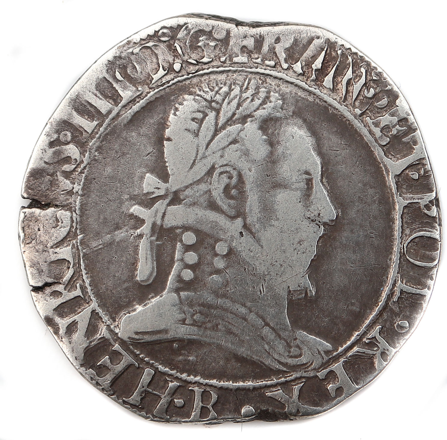 .HENRICVS III.D.G.FRAN.ET.POL.REX.B Henri III par la grâce de Dieu roi des Francs et des Polonais. Buste lauré et cuirassé à droite. Col plat. Lettre d'atelier dans lalégende sous l'effigie |