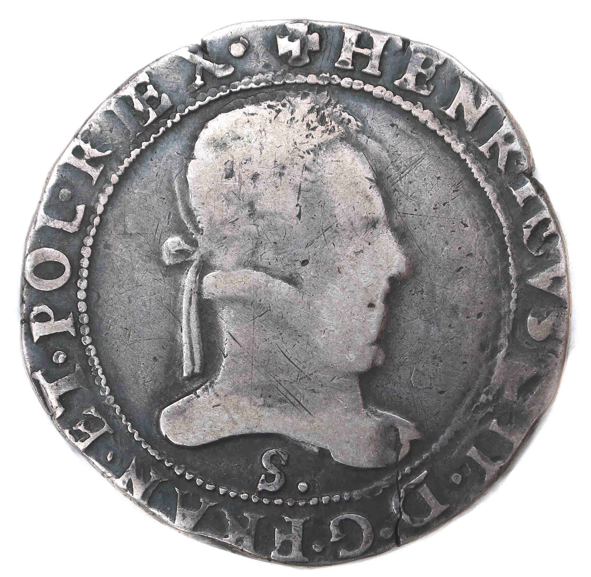.+HENRICVS III.D.G.FRAN.ET.POL.REX. Henri III par la grâce de Dieu roi des Francs et des Polonais. Buste lauré et cuirassé à droite. Col plat. Millésime sous l'effigie |
