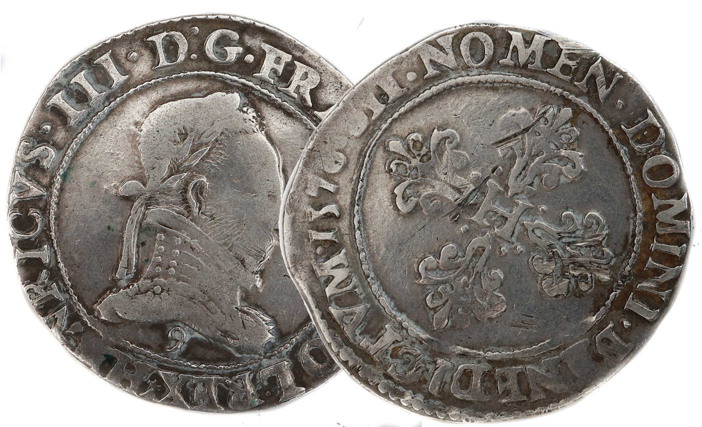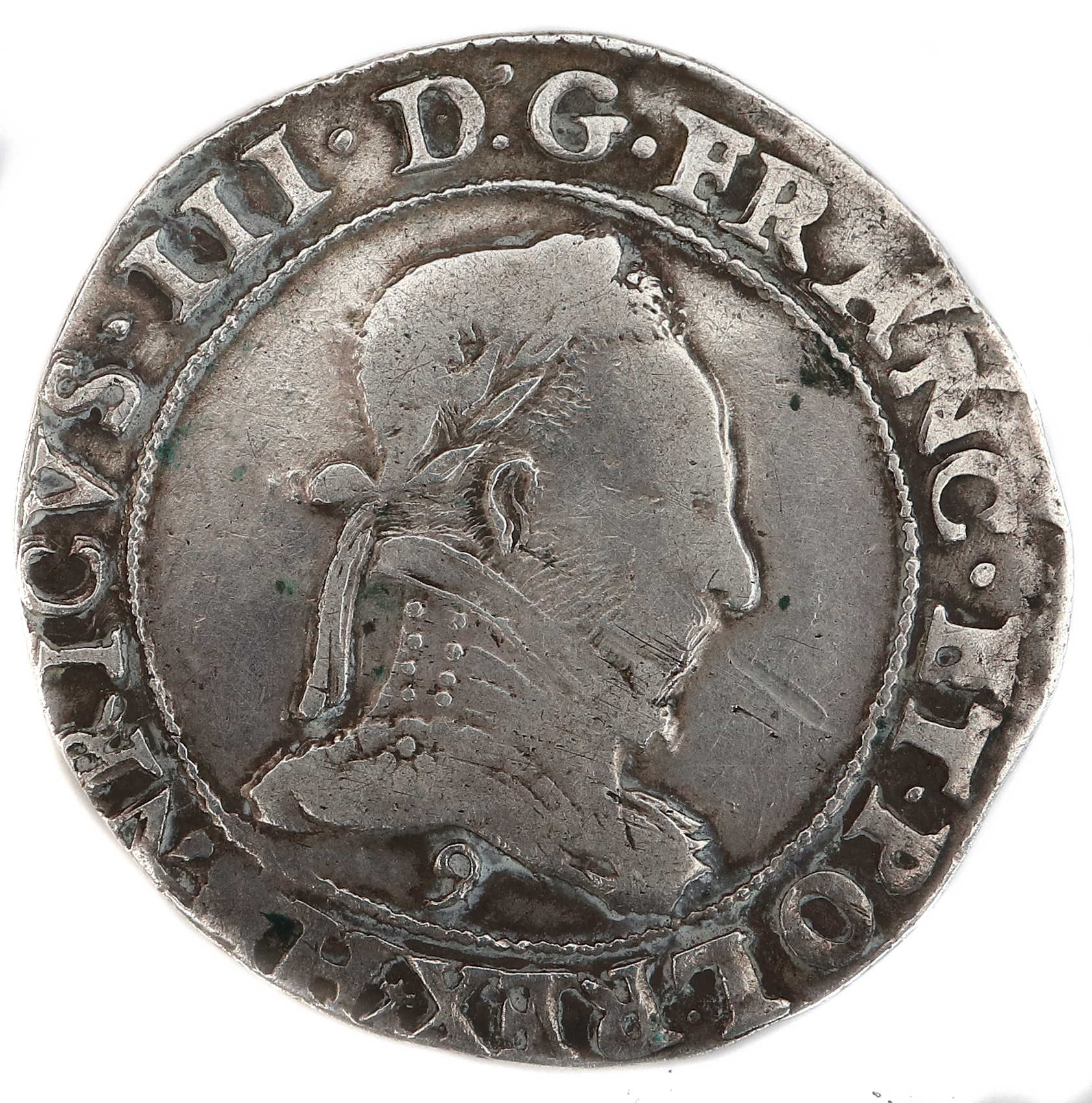 HENRICVS III.D:G.FRANC.ET.POL.REX(dif) Henri III par la grâce de Dieu roi des Francs et des Polonais. Buste lauré et cuirassé à droite. Col plat. Lettre d'atelier sous l'effigie |