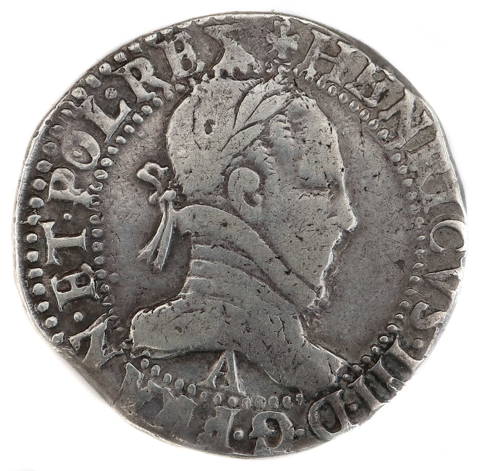 +HENRICVS III.D.G.FRAN.ET.POL.REX Henri III par la grâce de Dieu roi des Francs et des Polonais. Buste lauré et cuirassé à droite. Col plat. Lettre d'atelier sous l'effigie |