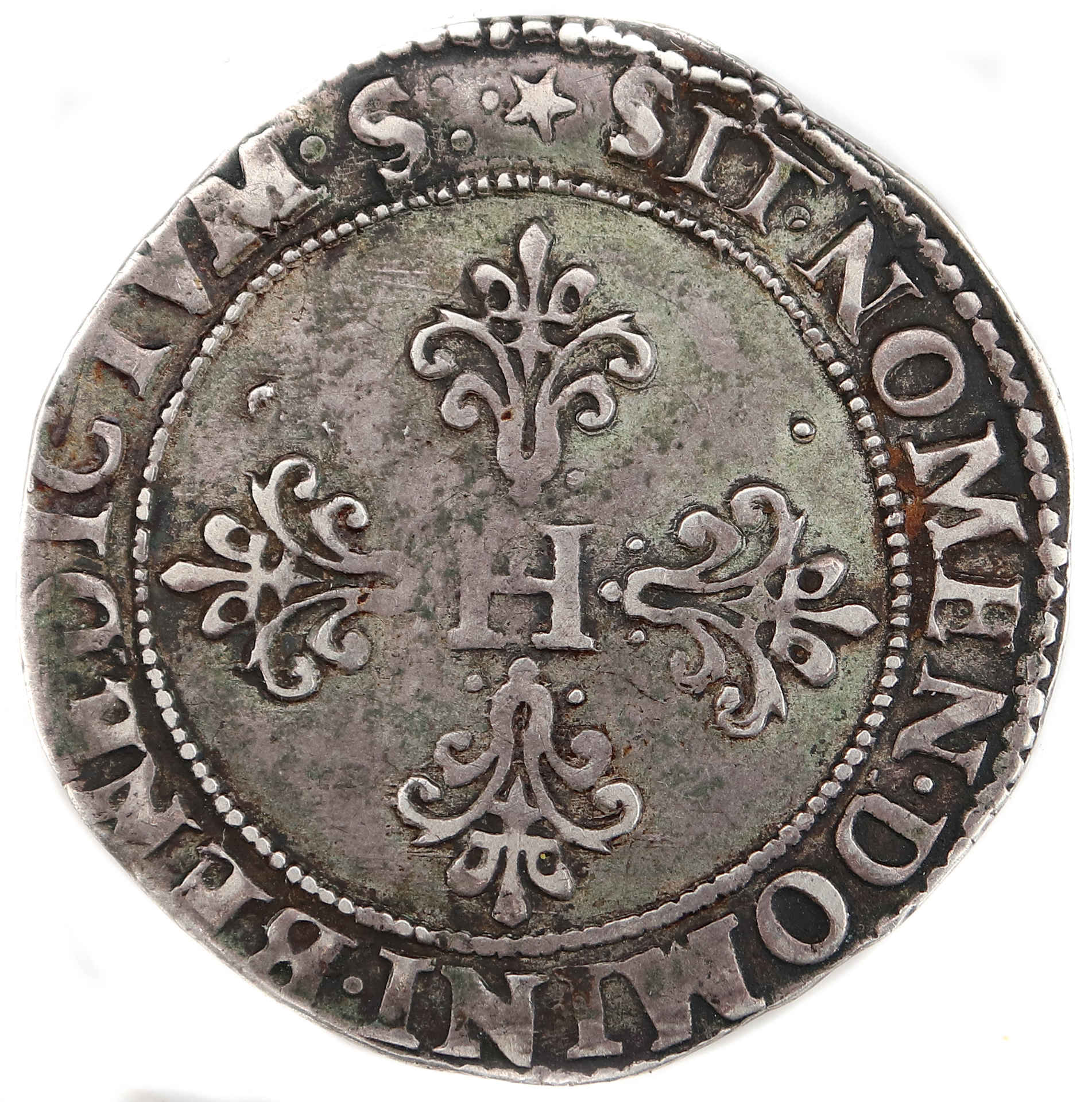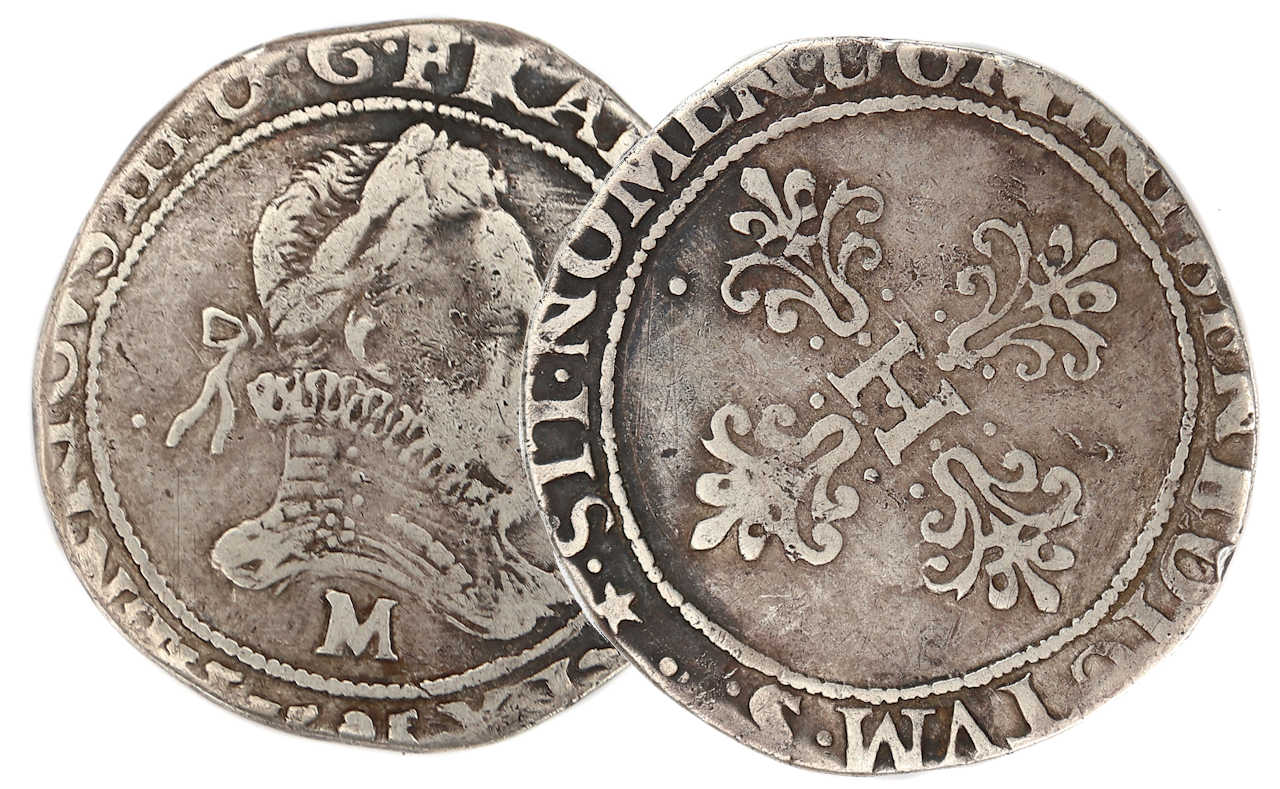 On trouve aussi des francs au col plat en 1586, 1593 et 1594 Le flan est un peu court, probablement rogné d'où un poids trés léger. Une partie des légendes est hors