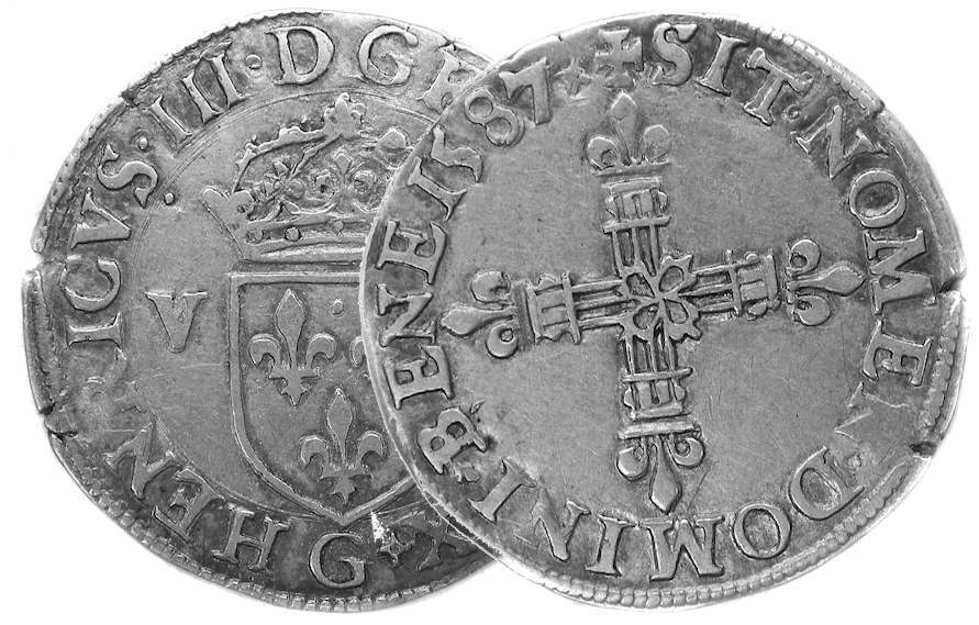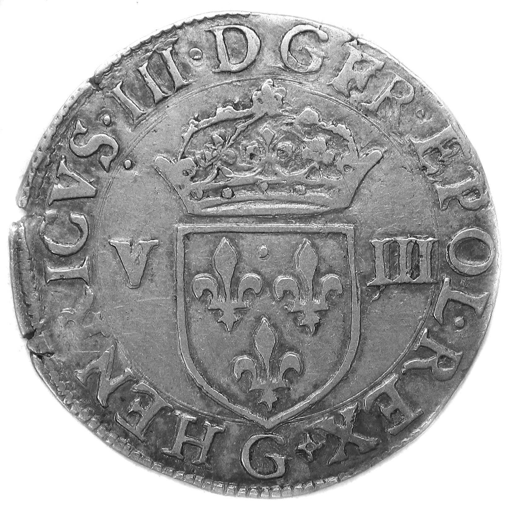 droit àlapointe del'écu) Point secret : 8 éme (au droit) Millésime : 1587 Chiffre de frappe connu : 72 576 ex (avec quart d'écu) |