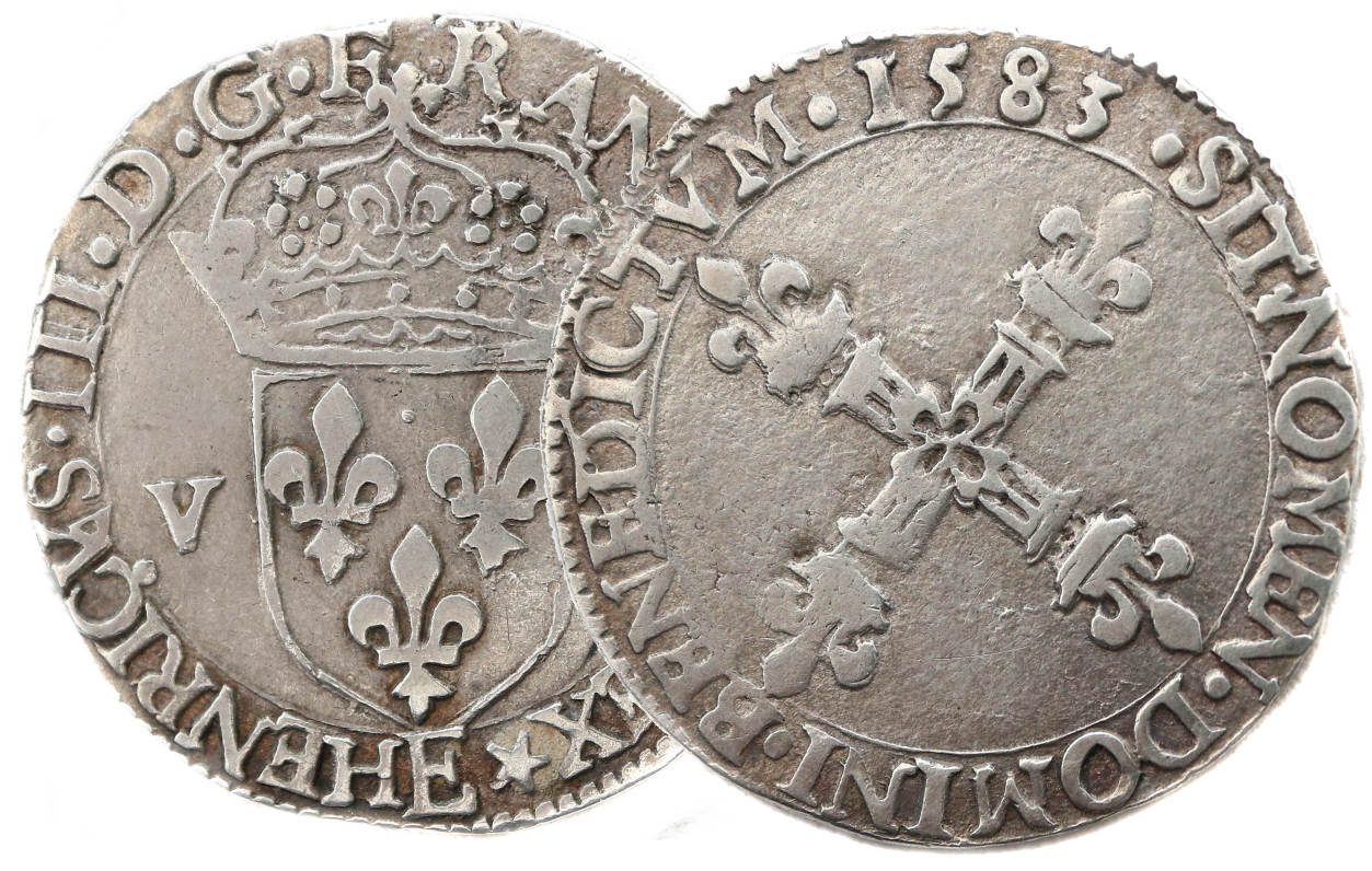 droit dans la légende sous l'écu) Point secret : 6éme (au droit) Millésime : 1583 Chiffre de frappe connu : 42 941 ex (avec les quarts d'écu). Indice de rareté Gad/Sb