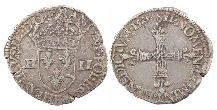 droit dans la légende sous l'écu) Point secret : Non Millésime : 1586 Chiffre de frappe connu : 31 727 ex (avec huitièmes d'écu) |