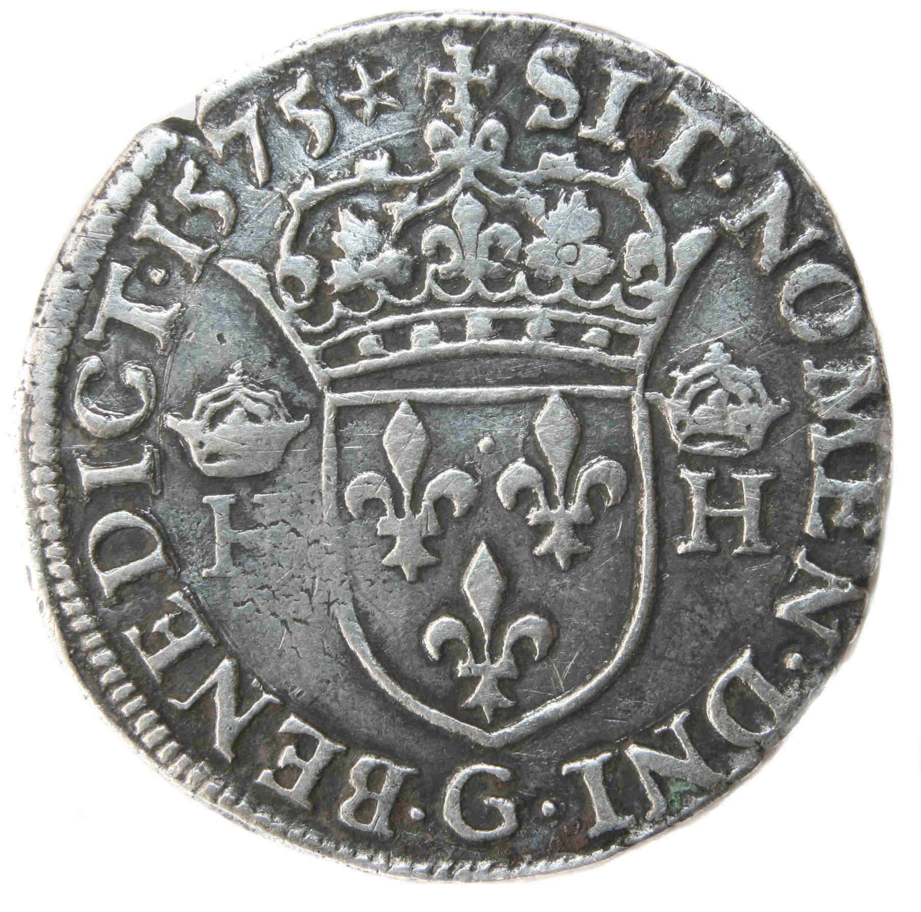 +SIT.NOMEN.DNI.G.BENEDICT.1575(dif) Béni soit le nom du Seigneur Ecu de France couronné, accosté