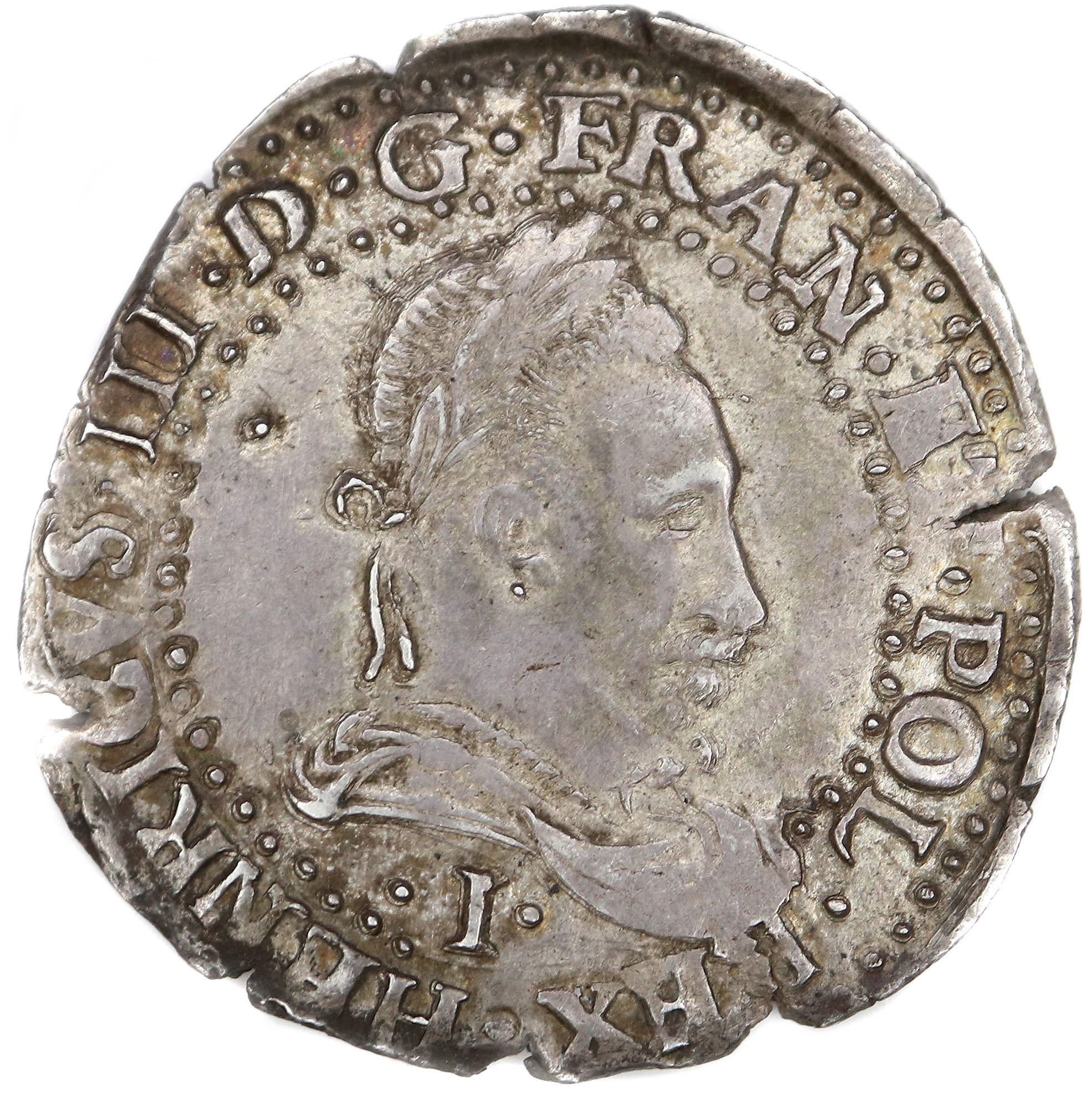 III.D.G.FRAN.ET.POL.REX. Henri III par la grâce de Dieu roi des Francs et des Polonais Buste lauré et cuirassé, au col