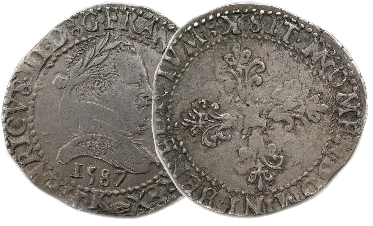 droit sous le buste et au revers en début de légende) Point secret : non Millésime : 1587 Chiffre de frappe connu : 126 684 ex (avec 1/4 de franc) |