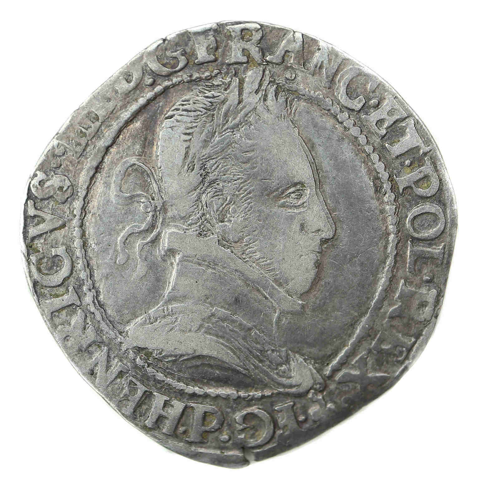 .HENRICVS III.D G.FRANC.ET.POL.REX.(dif) P Henri III par la grâce de Dieu roi des Francs et des Polonais Buste lauré et cuirassé, au col