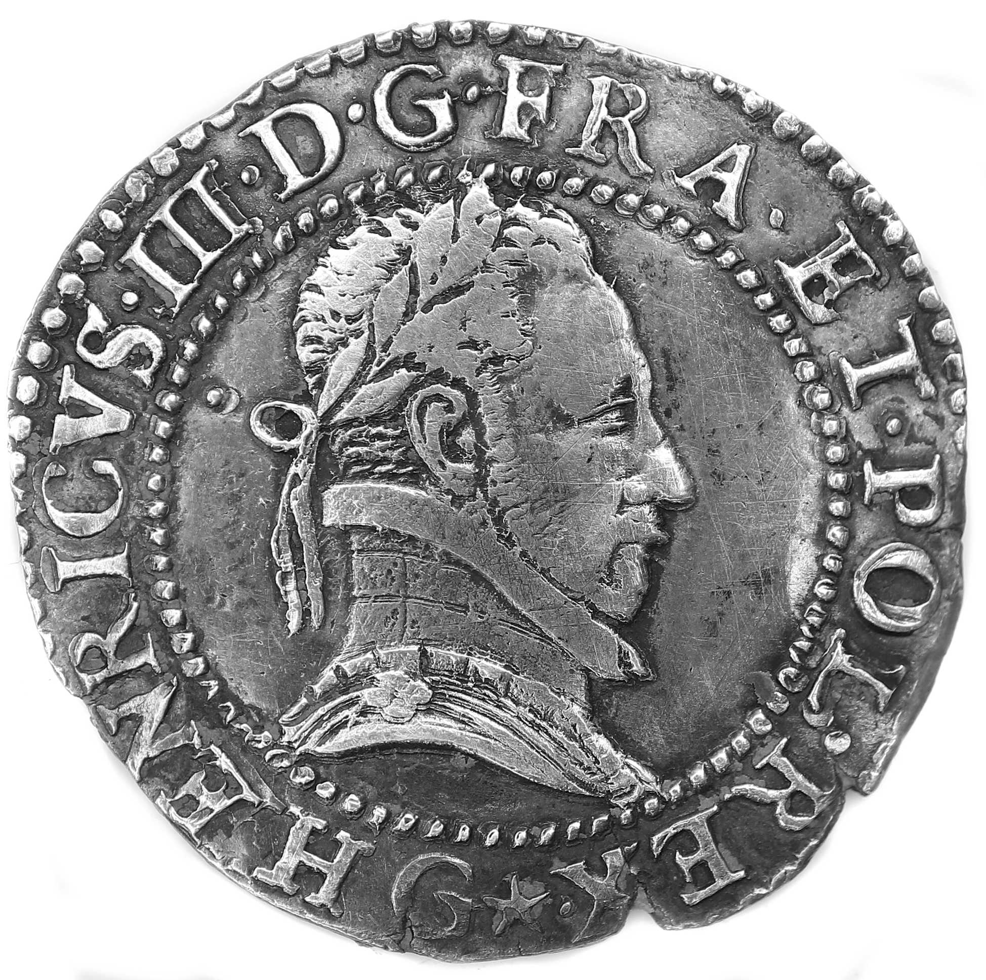 III.D G.FRA.ET.POL.REX.(dif) G Henri III par la grâce de Dieu roi des Francs et des Polonais Buste lauré et cuirassé, au col