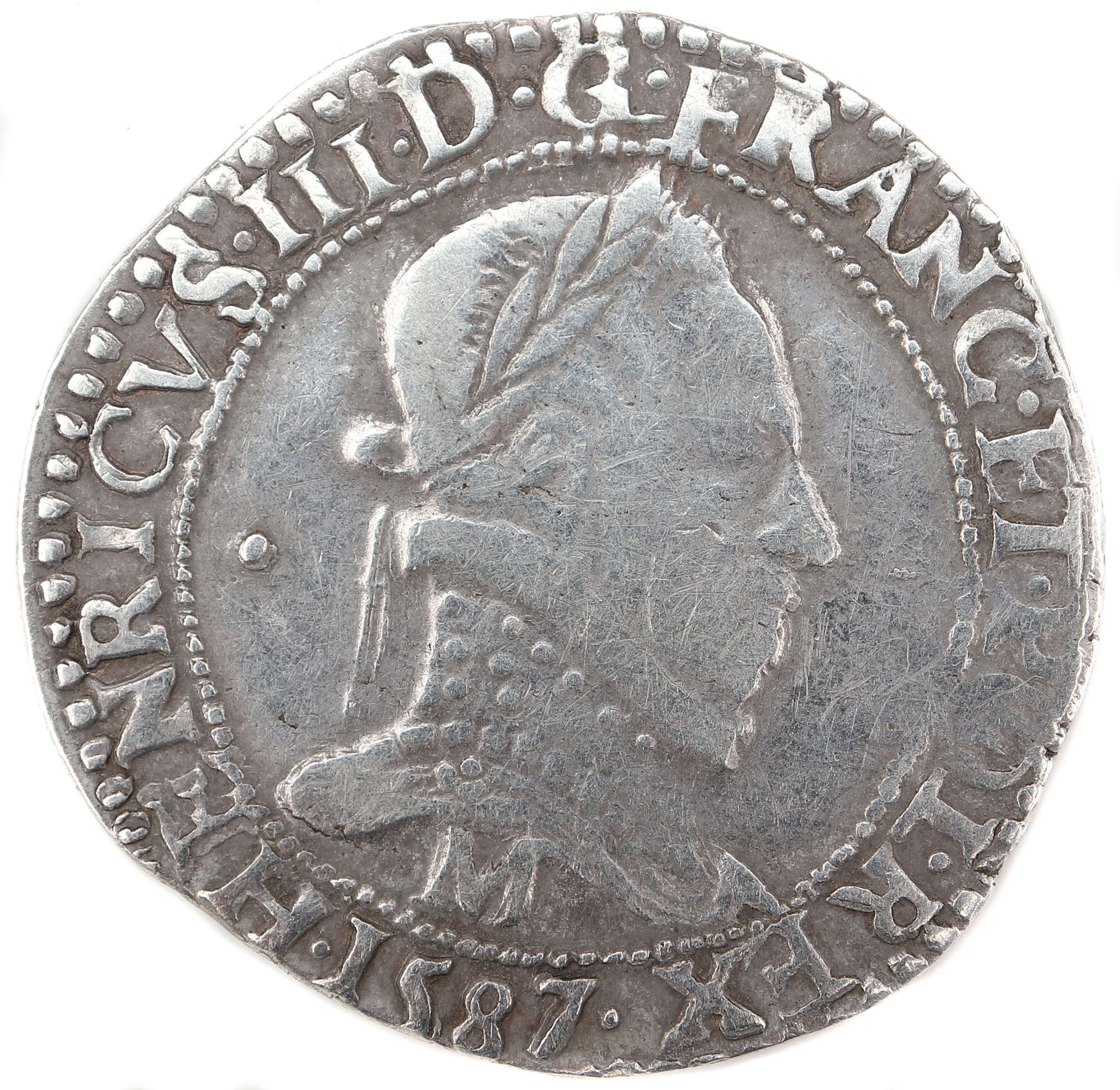.HENRICVS III.D.G.FRANC.ET.POL.REX.1587 M Henri III par la grâce de Dieu roi des Francs et des Polonais Buste lauré et cuirassé, au col