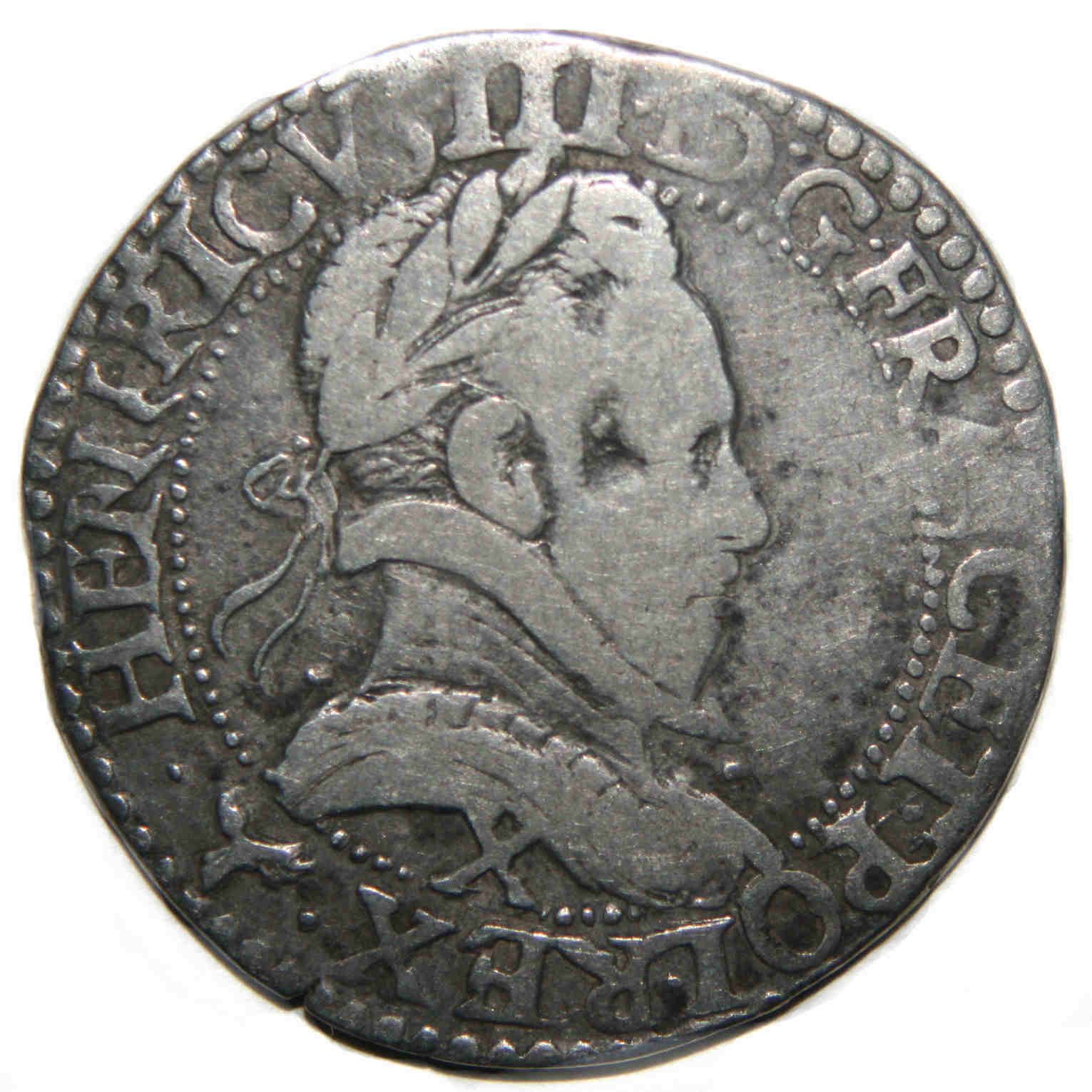 III.D.G.FRANC.ET.POL.REX.(dif) Henri III par la grâce de Dieu roi des Francs et des Polonais Buste lauré et cuirassé, au col