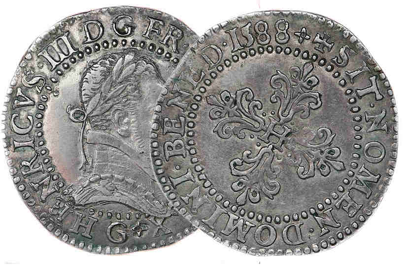 la légende sous le buste) Point secret : 8éme (au droit) Millésime : 1588 Chiffre de frappe connu : 29 494 ex (avec 1/4 de fr) Indice de rareté : C |