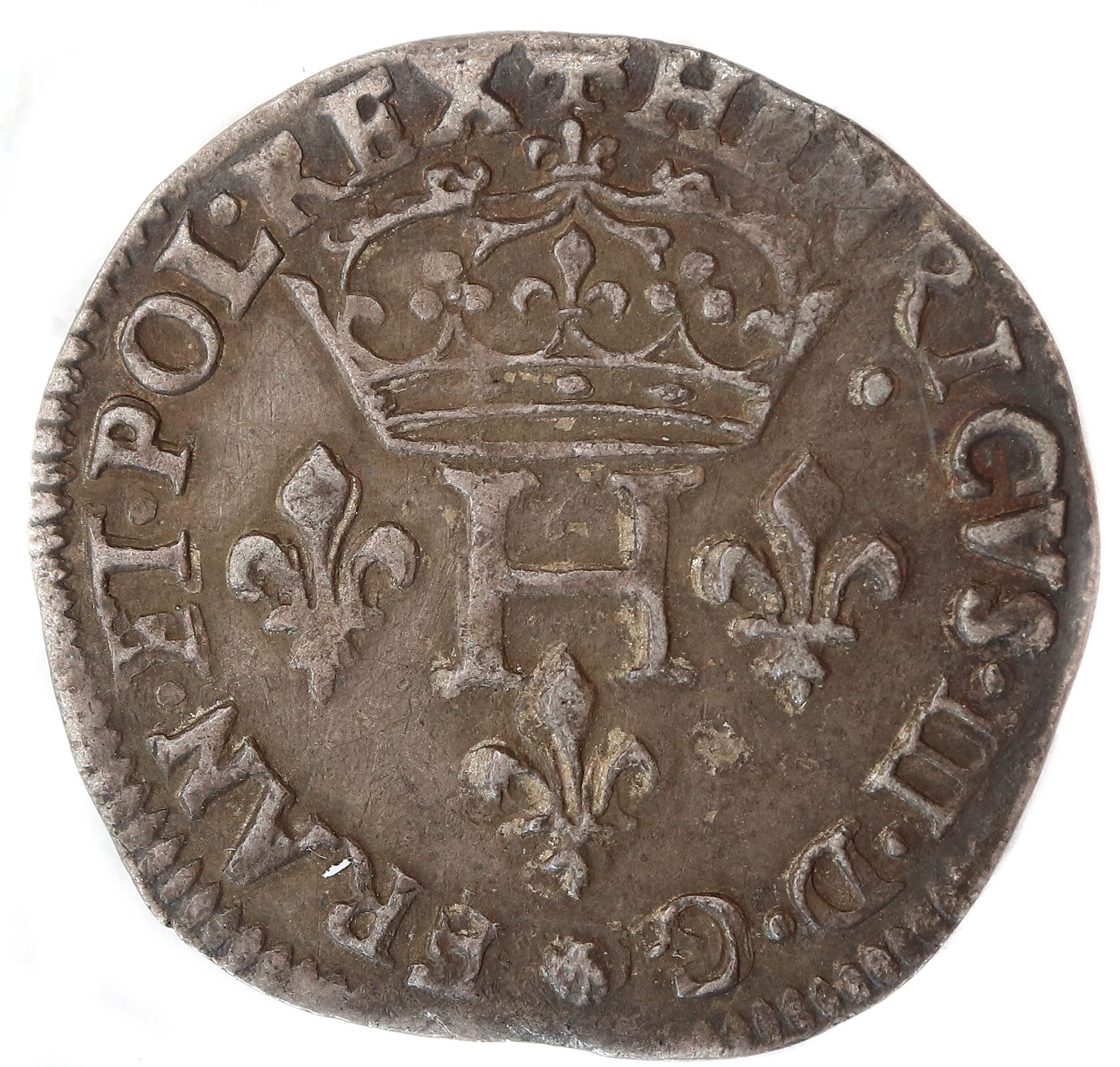 III.D(dif)G.FRAN.ET.POL.REX Henri III par la grâce de Dieu roi des Francs et des Polonais H couronnée entre 3 lis |