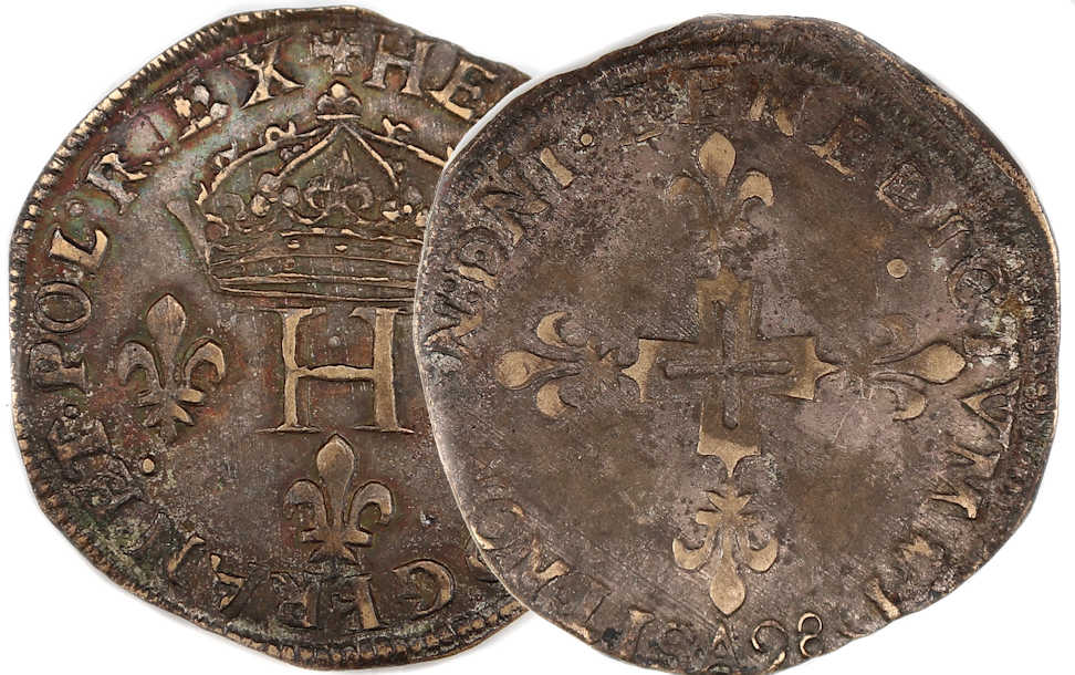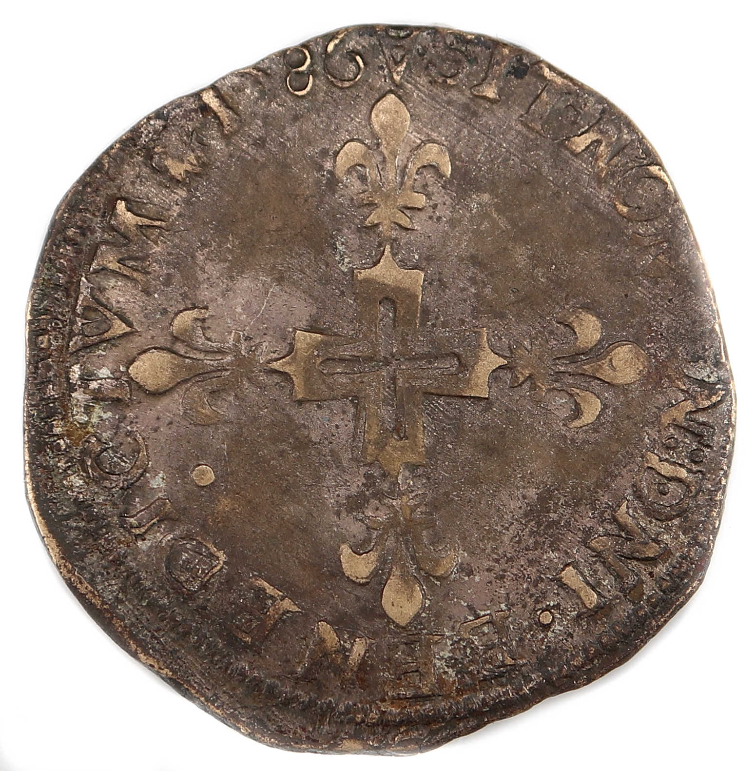 III.D.G.FRAN.ET.POL.REX Henri III par la grâce de Dieu roi des Francs et des Polonais H couronnée entre 3 lis |