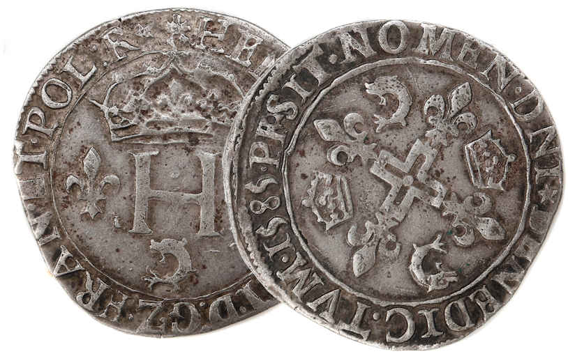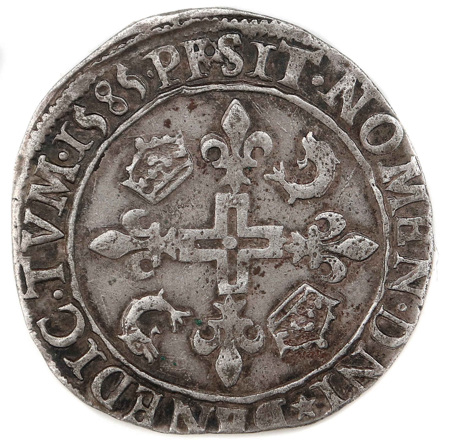 12 h au revers) Point secret : 5éme (au droit et au revers) Millésime : 1585 Chiffre de frappe connu : 55 280 ex (avec sols) |