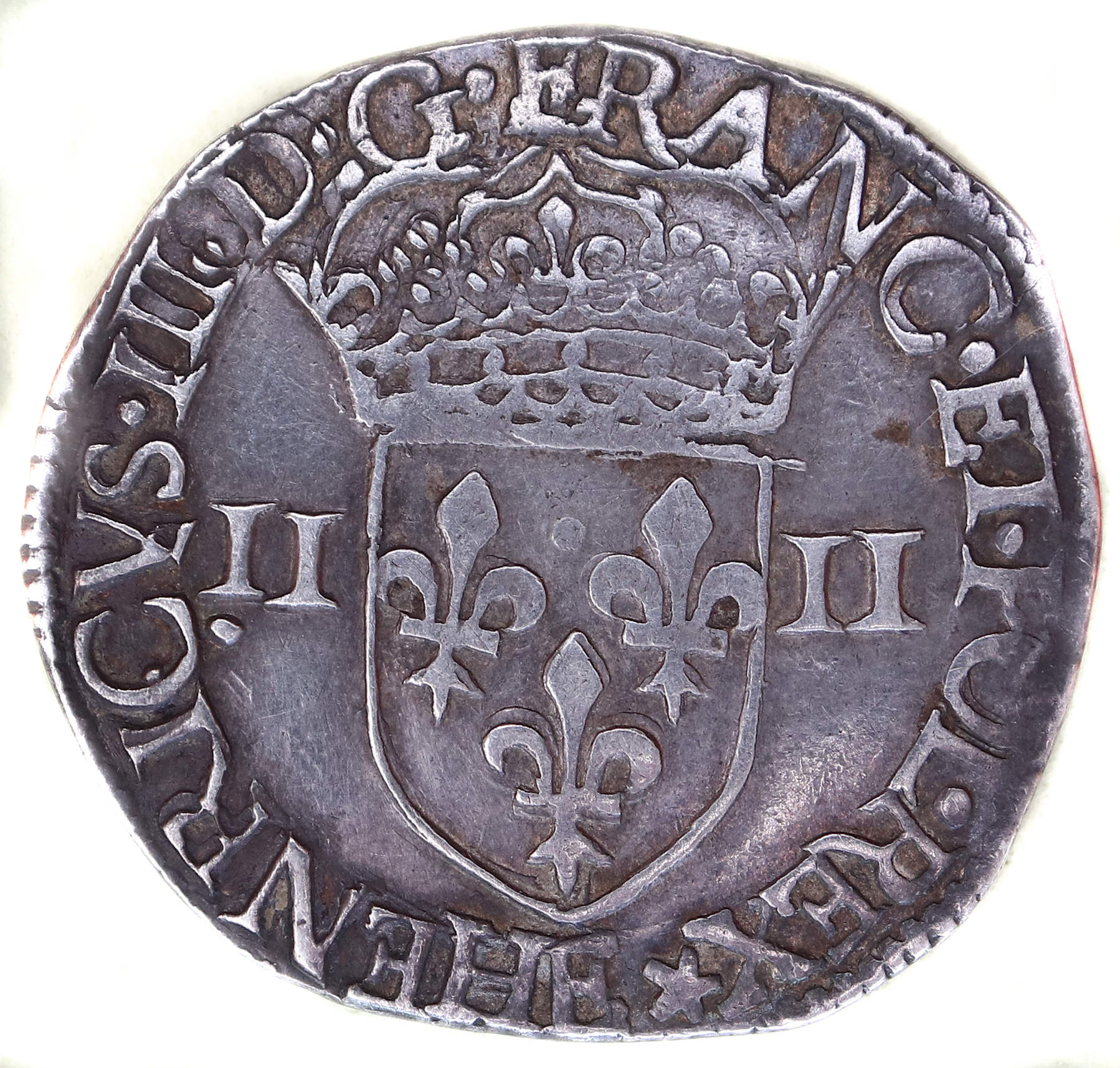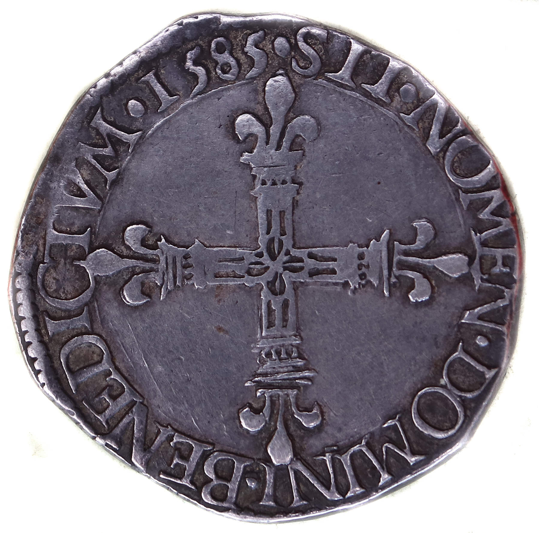 droit dans la légende sous l'écu) Point secret : 6éme (au droit) Millésime : 1585 Chiffre de frappe connu : 35 204 ex (avec huitiemes d'écu) |