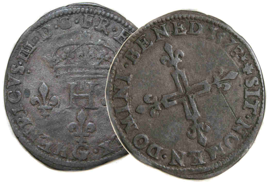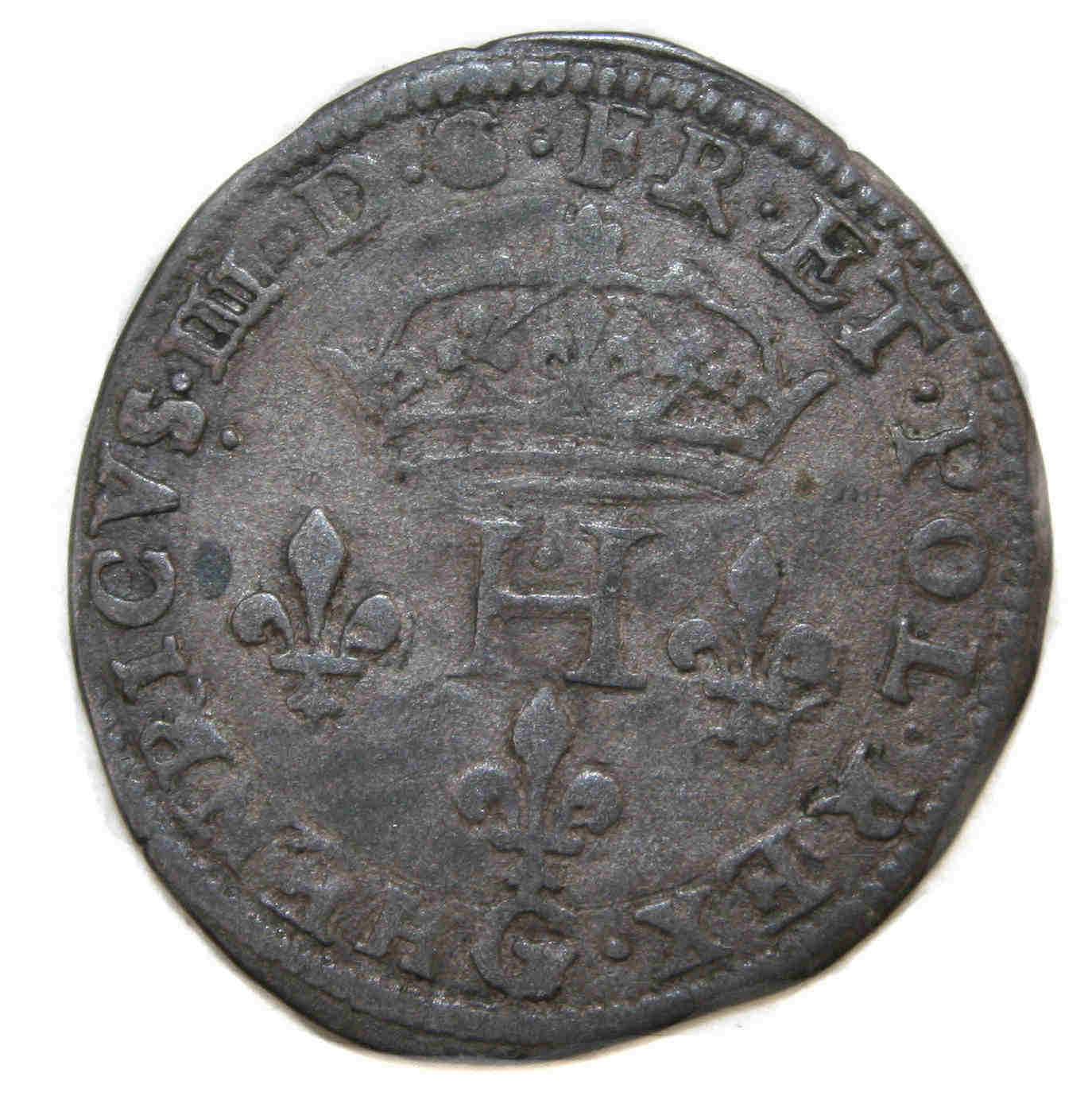 III.D.G.FR.ET.POL.REX.G Henri III par la grâce de Dieu roi des Francs et des Polonais H couronnée entre 3 lis |