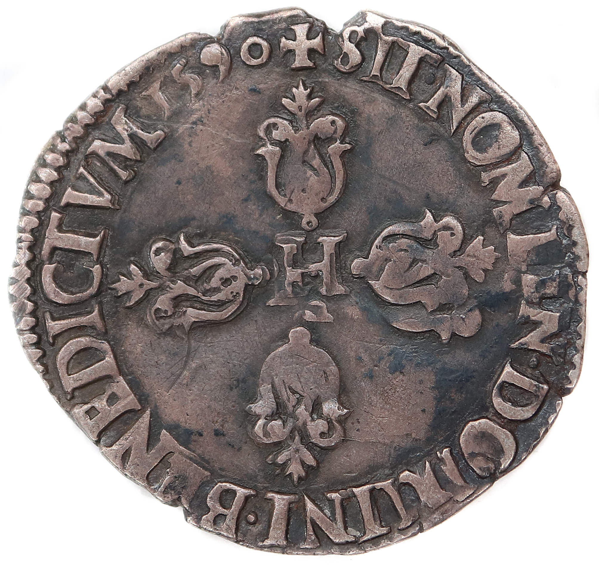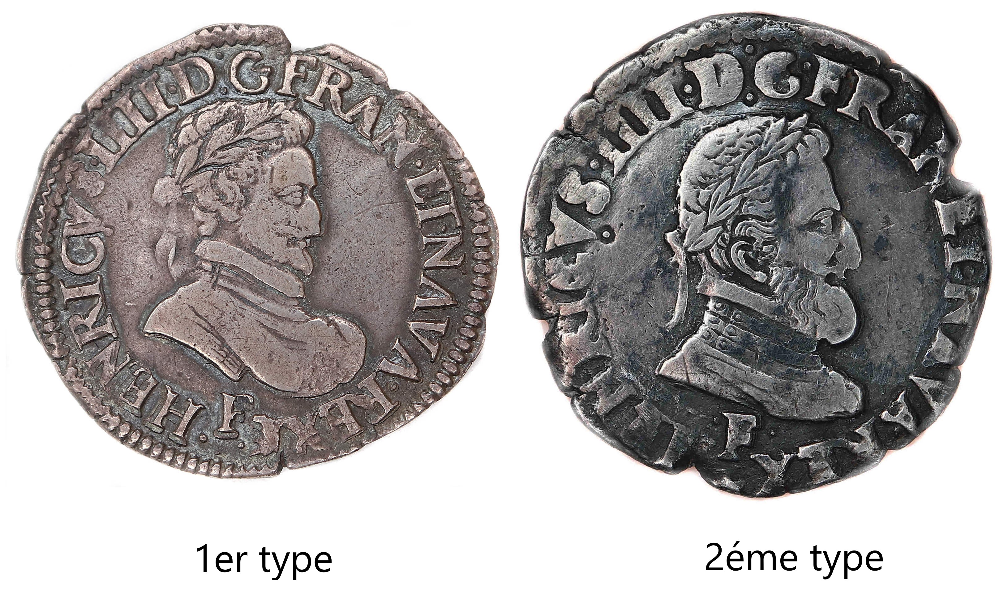 Lettre d'atelier : F (au droit sous l'effigie) Point secret : 7éme (au droit) Millésime : 1590 Chiffre de frappe connu : 21 114 (avec quarts) Indice de rareté : R4 |