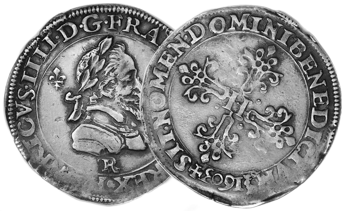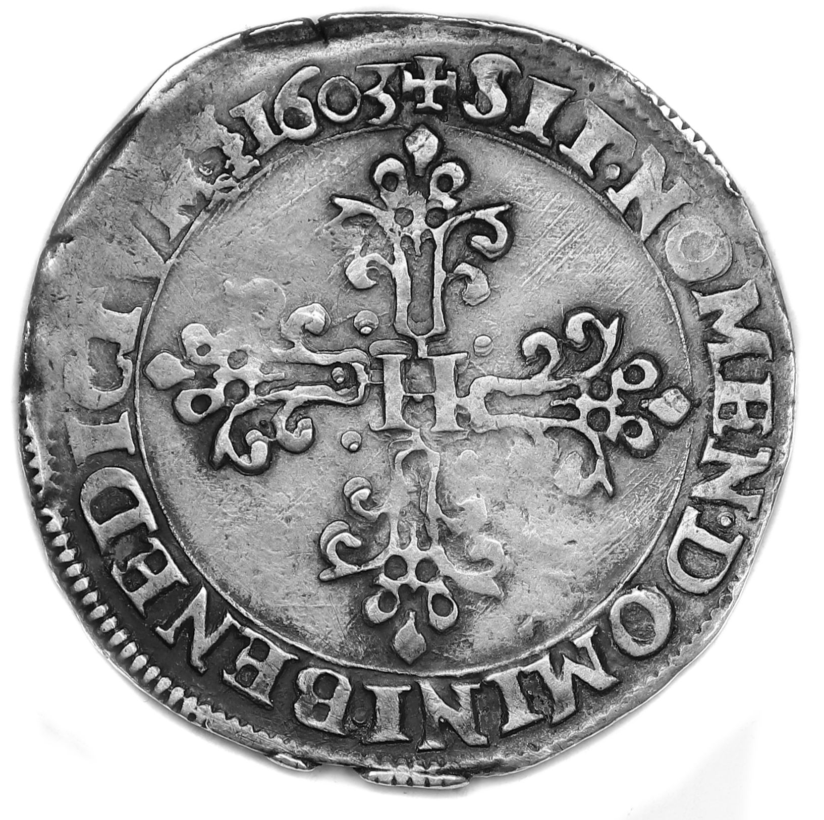 Lettre d'atelier : R (au droit sous le buste du roi) Point secret : Non Millésime : 1603 Chiffre de frappe connu : 109 813 ex (avec quart) Indice de rareté : C |