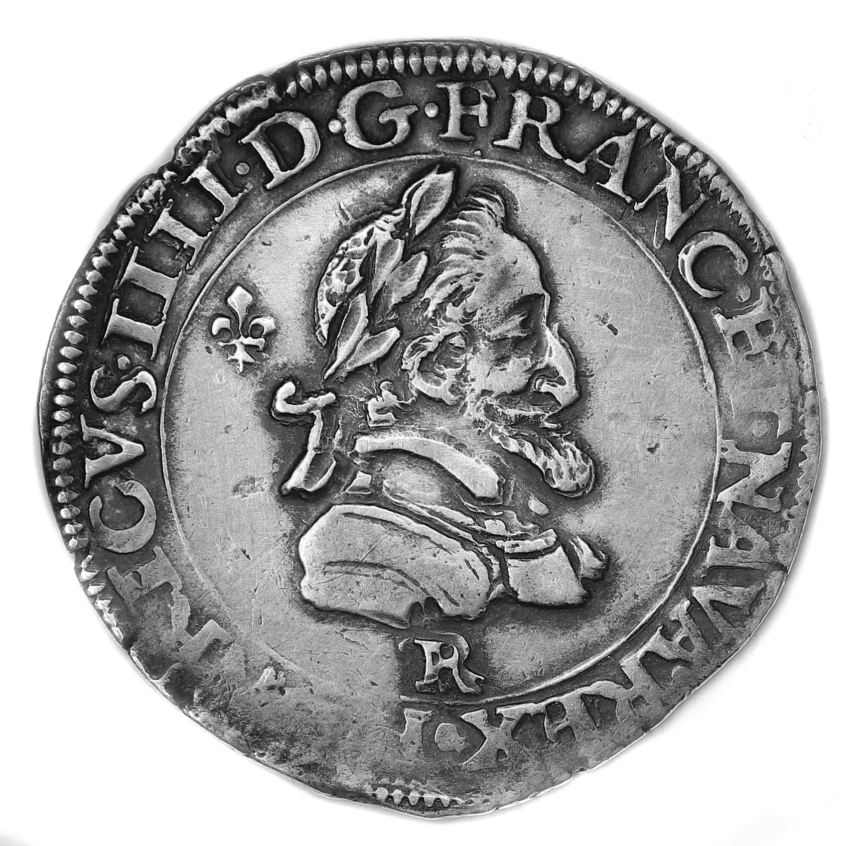 . HENRICVS. IIII.D.G.FRANC.ET.NAVA.REX. R Henri IIII par la grâce de Dieu roi de France et de Navarre. Buste âgé du roi à la tête laurée et à la