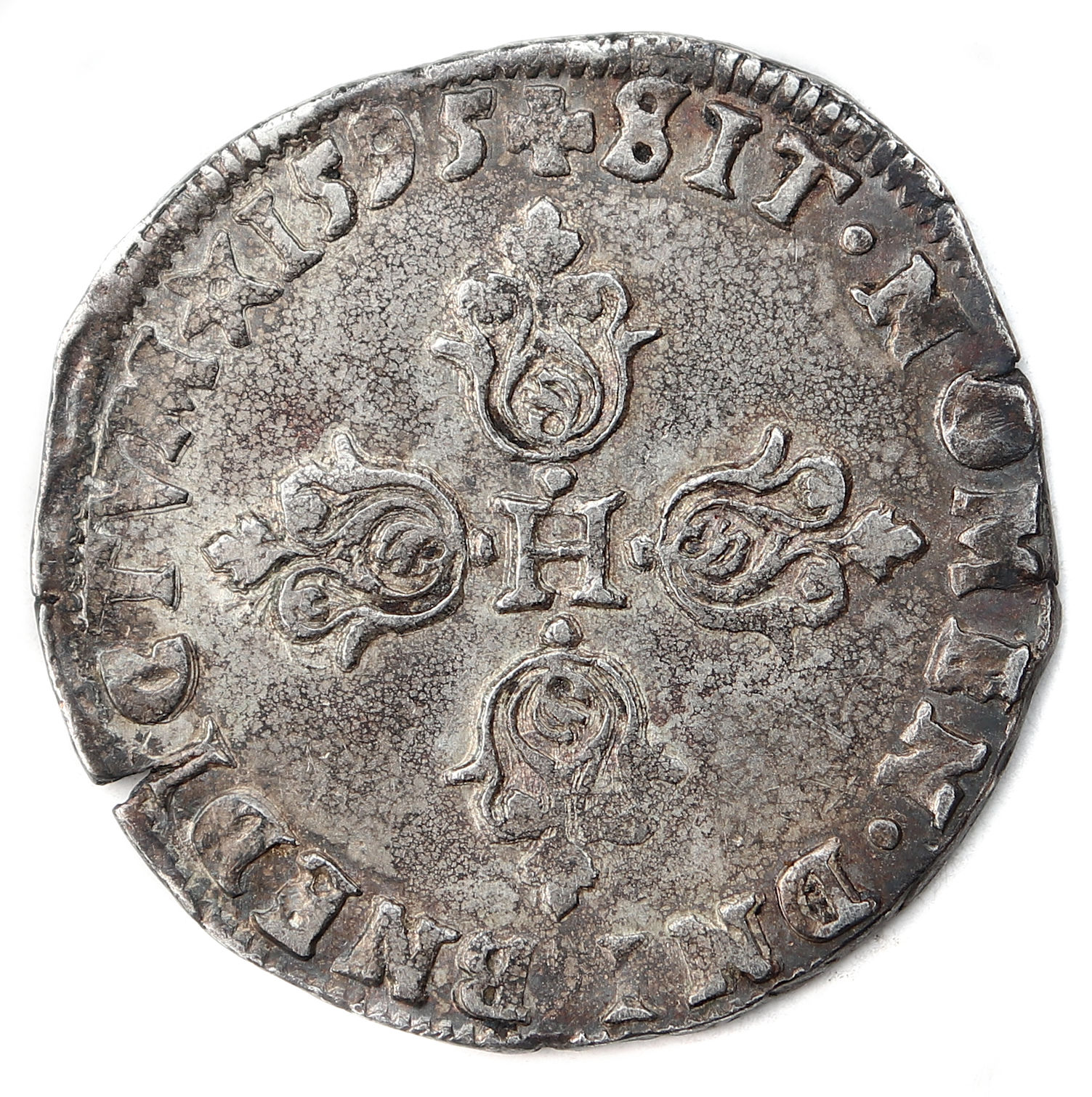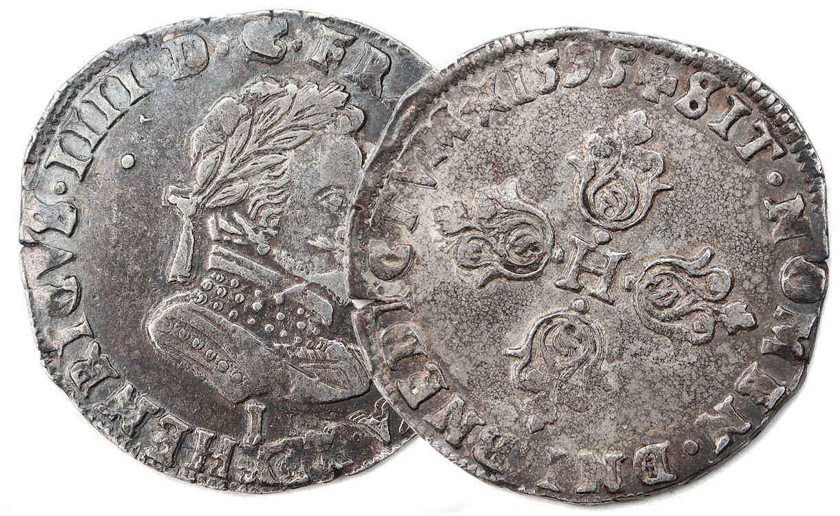 Lettre d'atelier : I (au droit sous le buste du roi) Point secret : 10éme (au droit) Millésime : 1595 Chiffre de frappe connu : 8