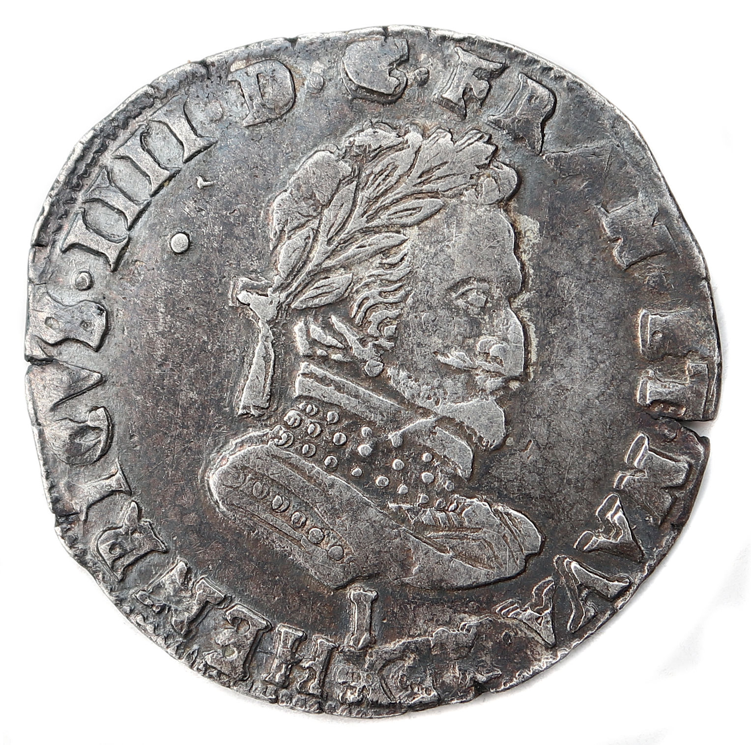 + HENRICVS. IIII.D.G.FRANC.ET.NAVA.REX. Henri IIIIpar la grâce de Dieu roi de France et de Navarre. Buste du roi à la tête laurée et à la cuirasse