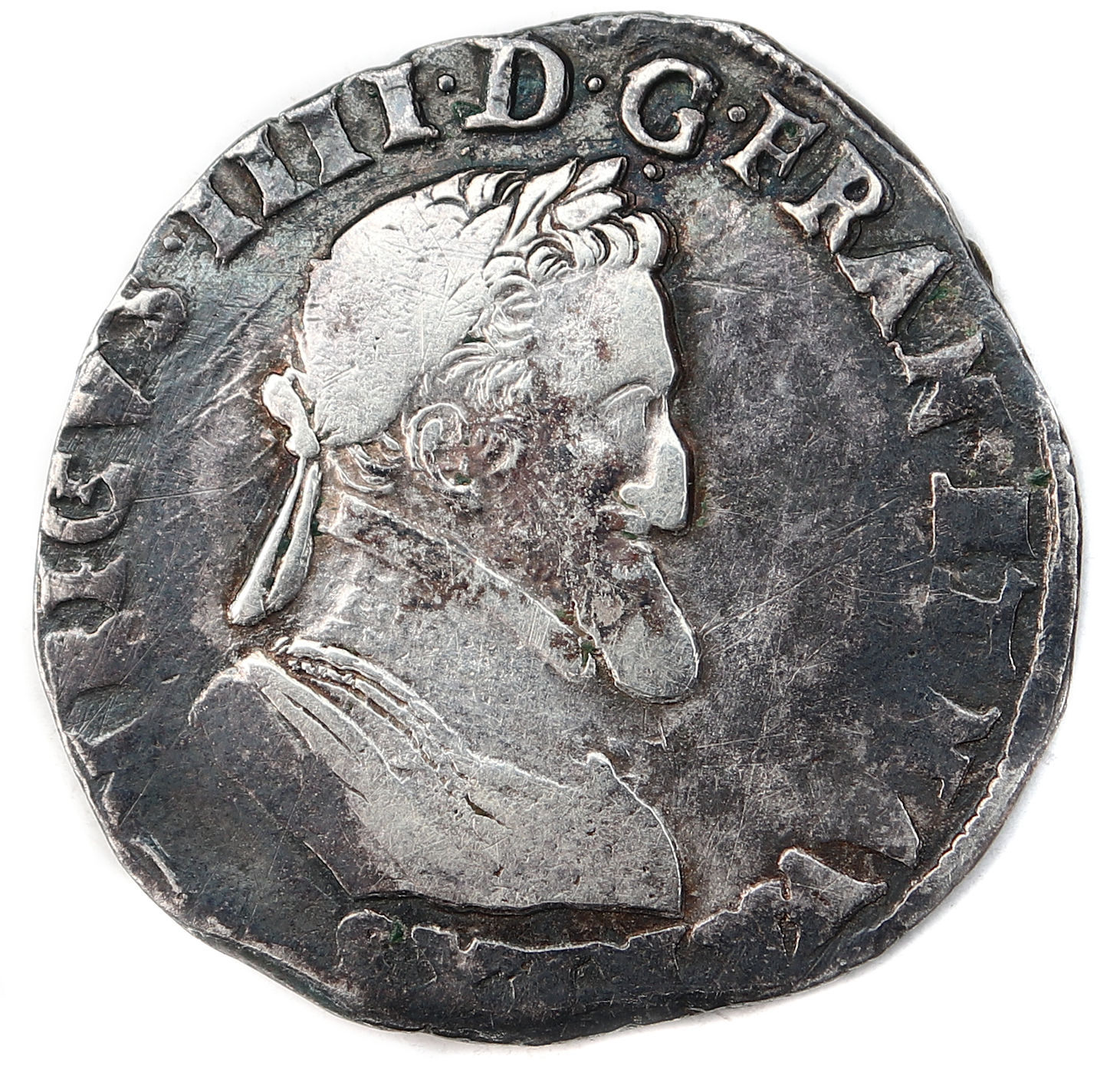 + HENRICVS. IIII.D.G.FRAN.ET.NAVA.REX.S Henri IIIIpar la grâce de Dieu roi de France et de Navarre. Buste du roi à la tête laurée et à la cuirasse