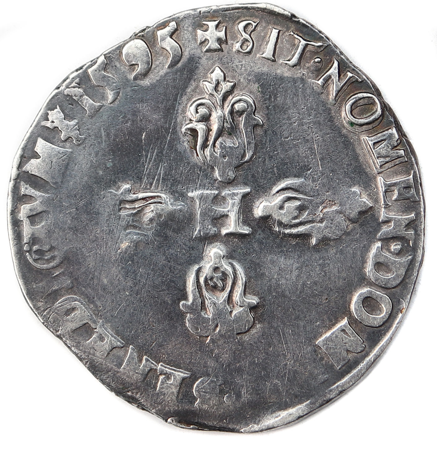 Lettre d'atelier : S (au droit sous le buste du roi) Point secret : 14éme (au droit) Millésime : 1595 Chiffre de frappe connu : 9 384 (avec quarts) Indice de rareté : R3 |