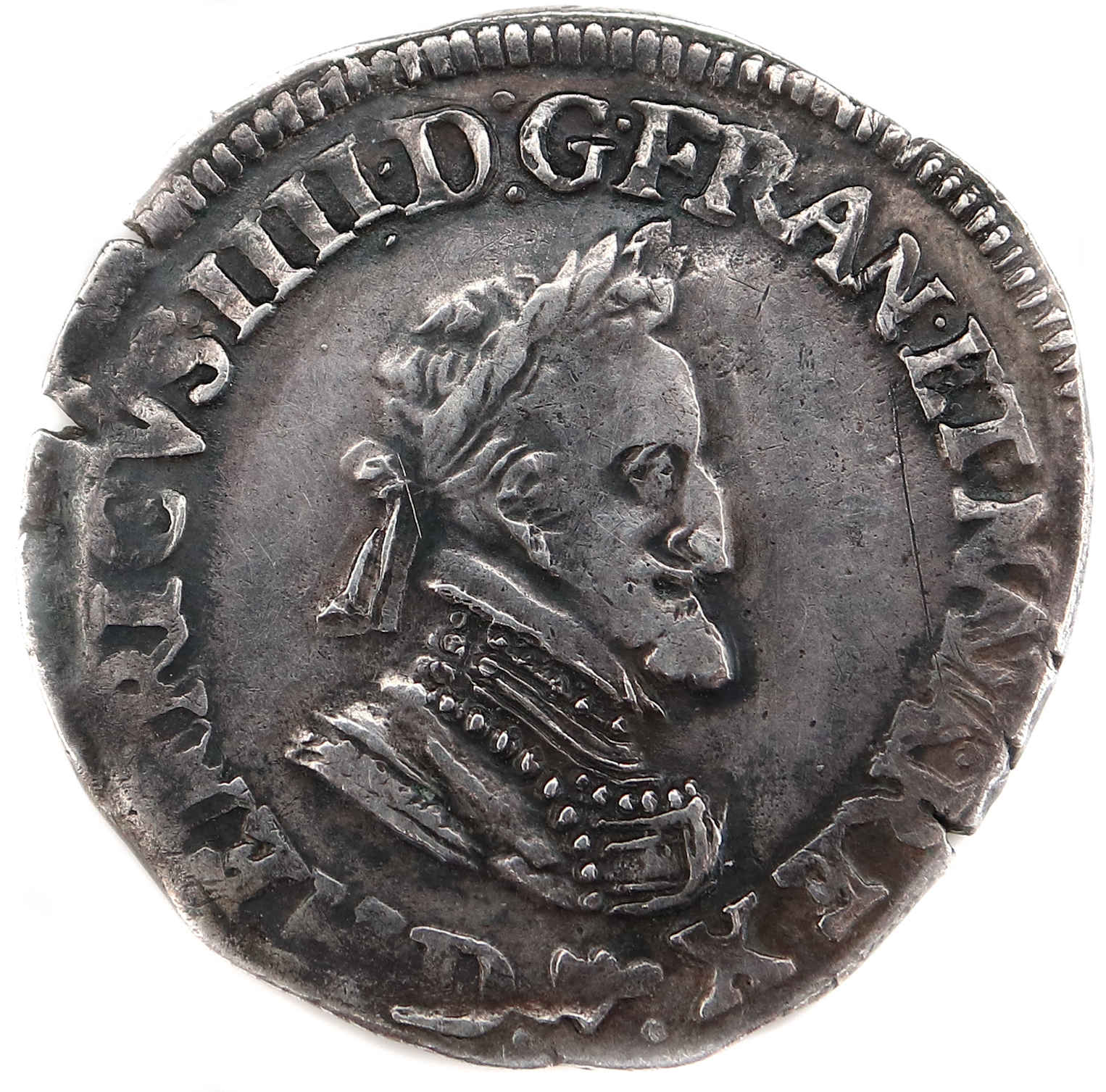 HENRICVS. IIII.D.G.FRAN.ET.NAVA.REX.(dif) Henri IIIIpar la grâce de Dieu roi de France et de Navarre. Buste du roi à la tête laurée et à la cuirasse