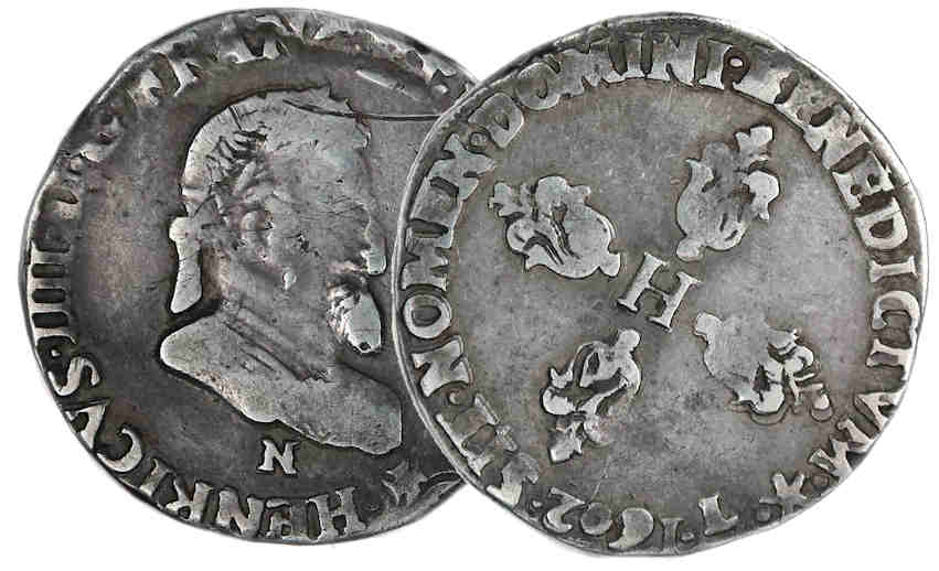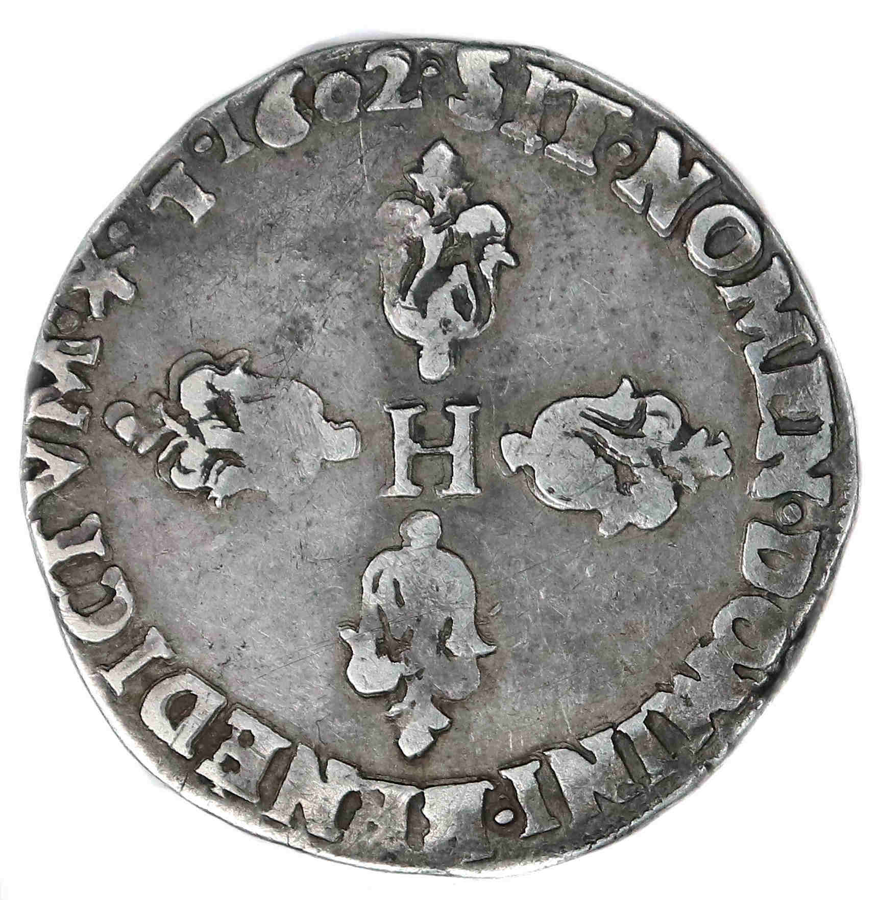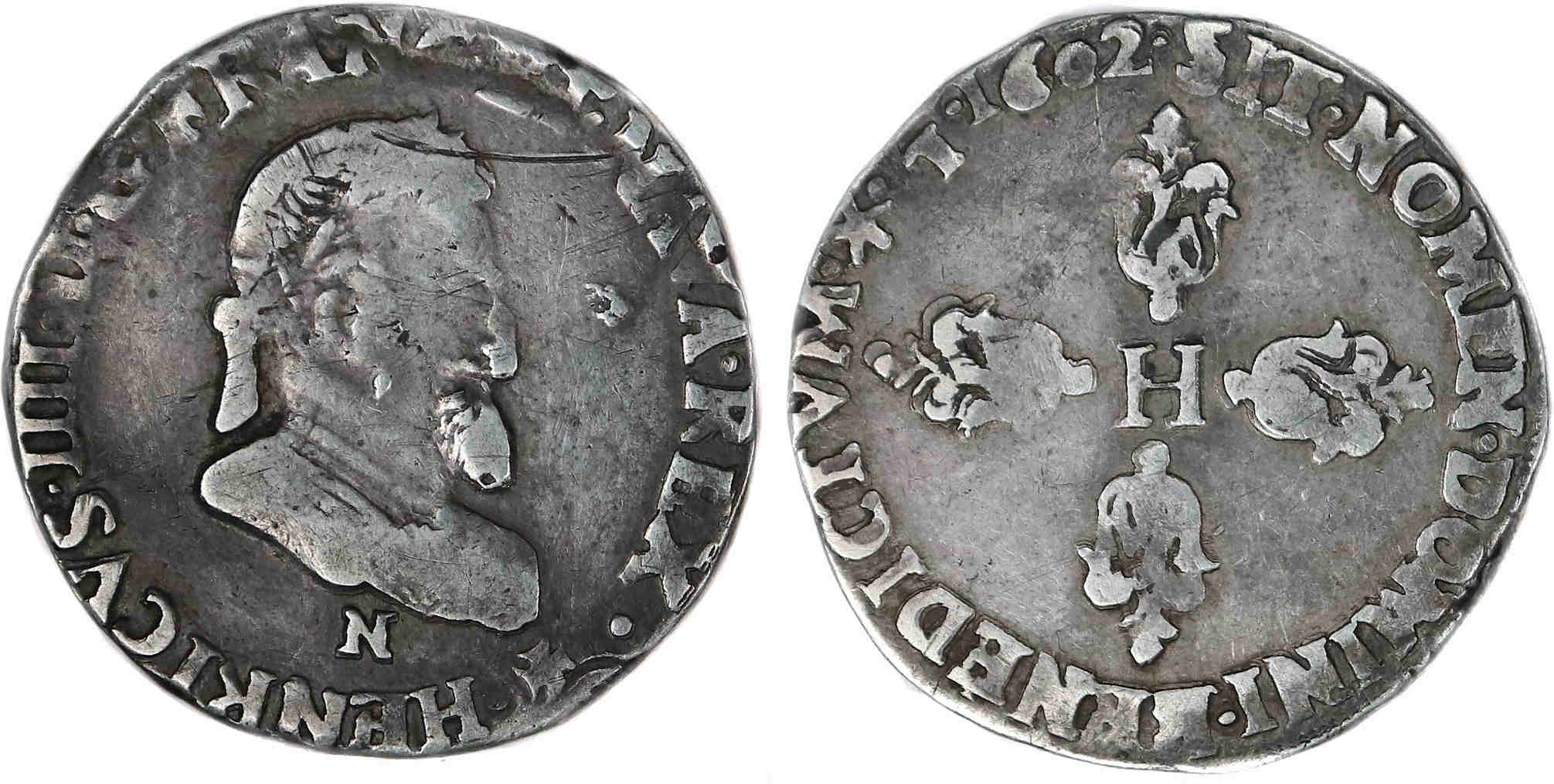 Lettre d'atelier : N (au droit sous le buste du roi) Point secret : NON Millésime : 1602 Chiffre de frappe connu : 75