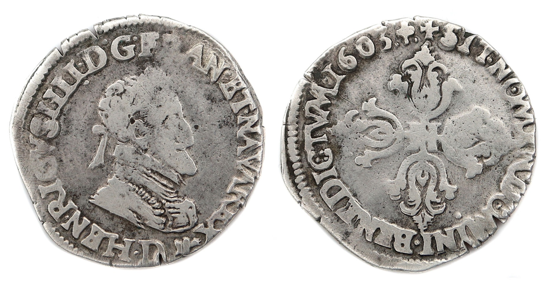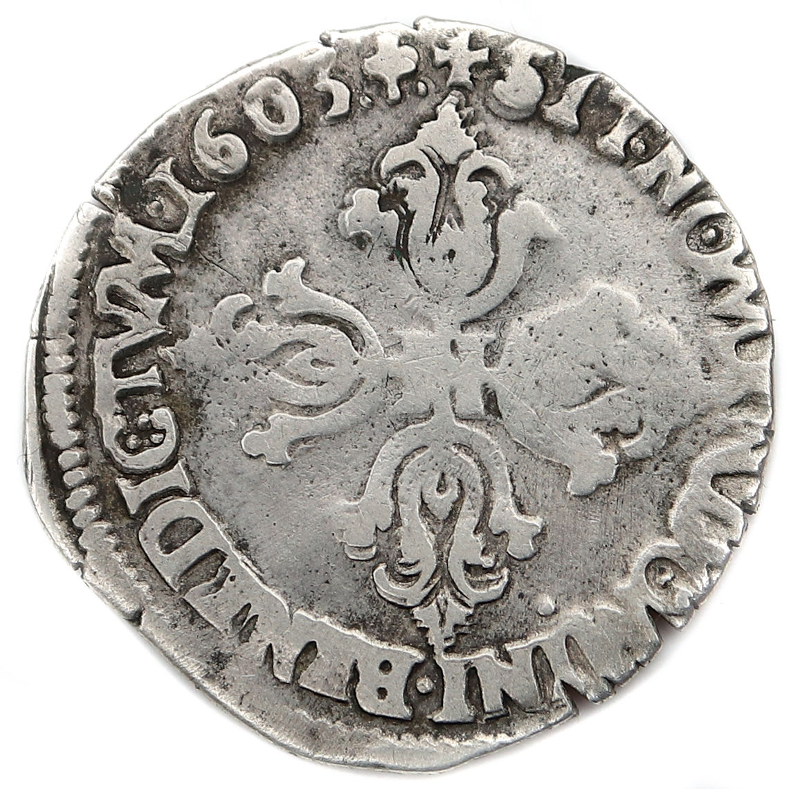 Lettre d'atelier : D (au droit sous le buste du roi) Point secret : 12éme (au droit et au revers) Millésime : 1605 Chiffre de frappe connu : 119