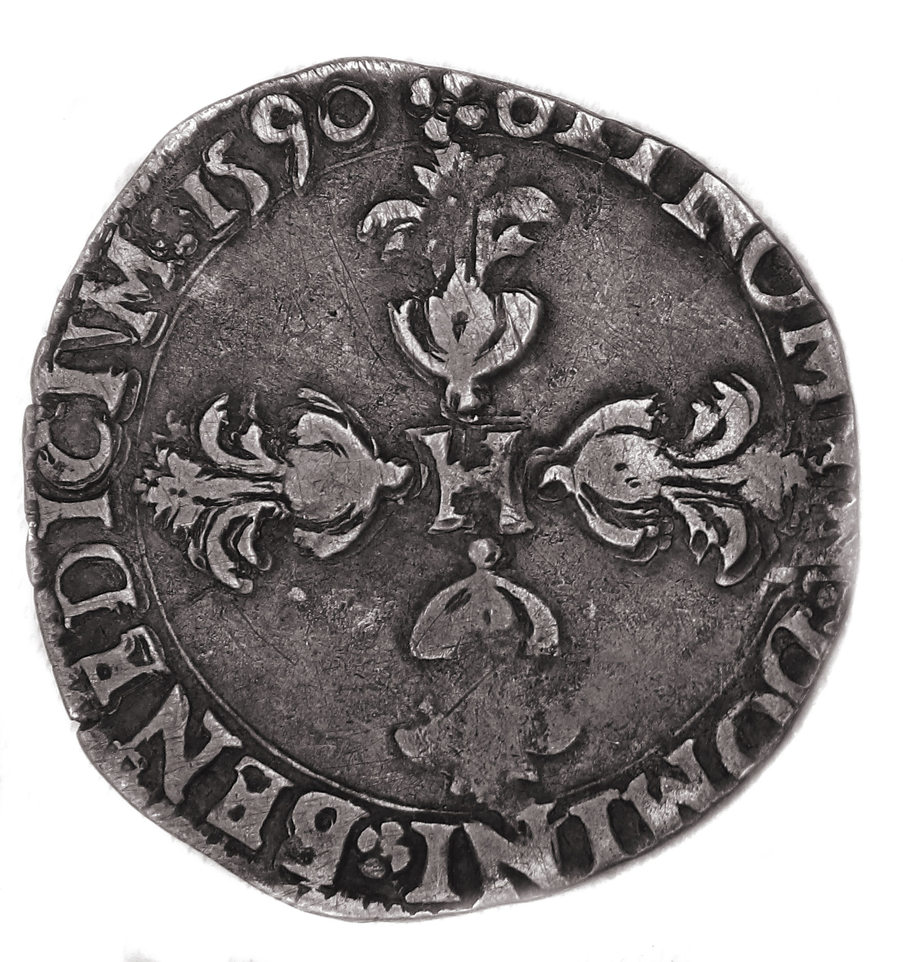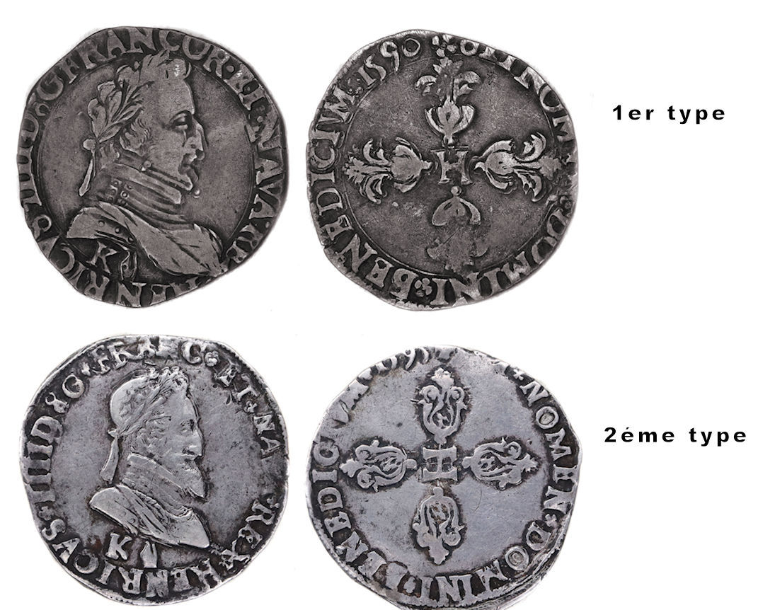 monnaie) de 1590 à 1593 puis au 2éme type de 1594 à 1608. Comme souvent pour les quarts et demis francs d'HENRI IV le