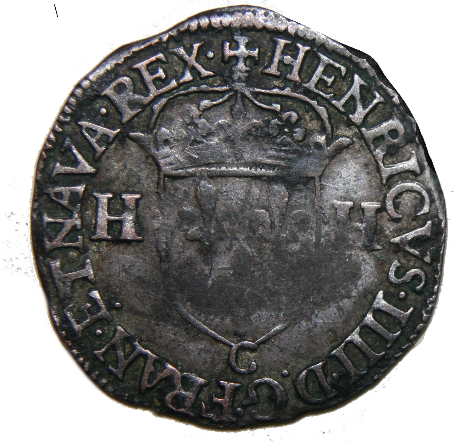 + HENRICVS. IIII.D.G.FRAN.ET.NAVA.REX Henri IIII par la grâce de Dieu roi de France et de Navarre. Ecu de France couronné, accosté de 2 H |